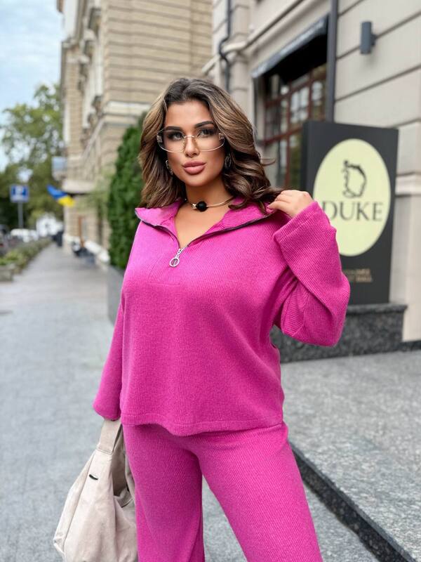 Костюм состоит из свободного свитера с воротником-стойкой и молнией, а также из брюк прямого силуэта с комфортной посадкой на талии. Свитер можно носить как застегнутым, так и расстегнутым, создавая разные стилистические решения — от повседневного до более элегантного. Брюки мягко облегают бедра и ниспадают свободными прямыми линиями, визуально вытягивая силуэт и придавая фигуре гармоничность.