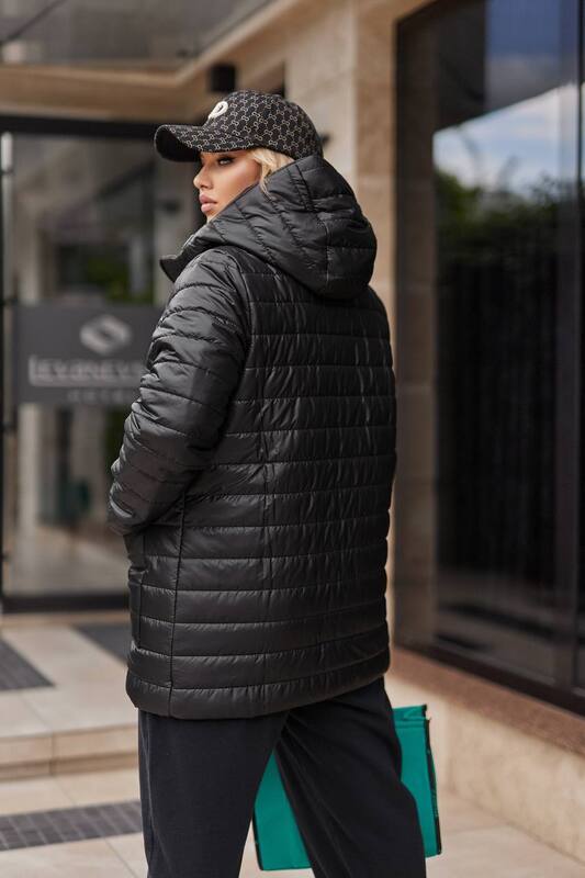 Куртка женская демисезонная чёрная стёганая с капюшоном из плащевки утеплённая синтепоном средняя k-123704