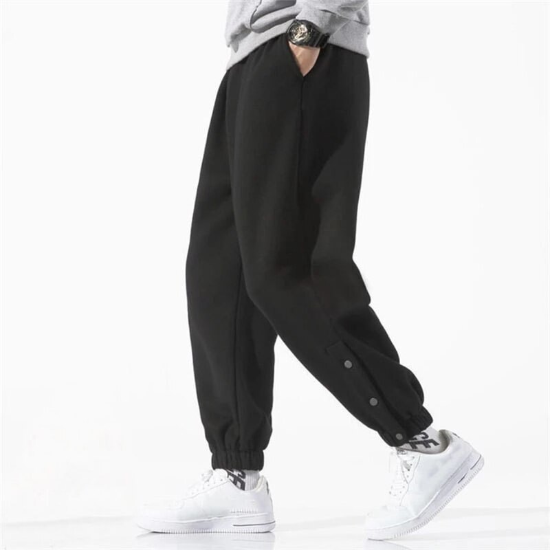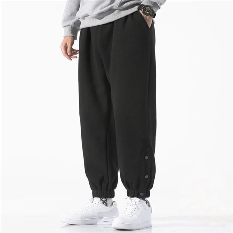 Модель выполнена в универсальном чёрном цвете, который легко сочетается с любой одеждой. Джоггеры имеют современный спортивный крой с зауженными штанинами и манжетами на резинке по низу, что подчёркивает стиль и удобство. Функциональные карманы добавляют практичности, а декоративные элементы с кнопками на манжетах делают образ более оригинальным.