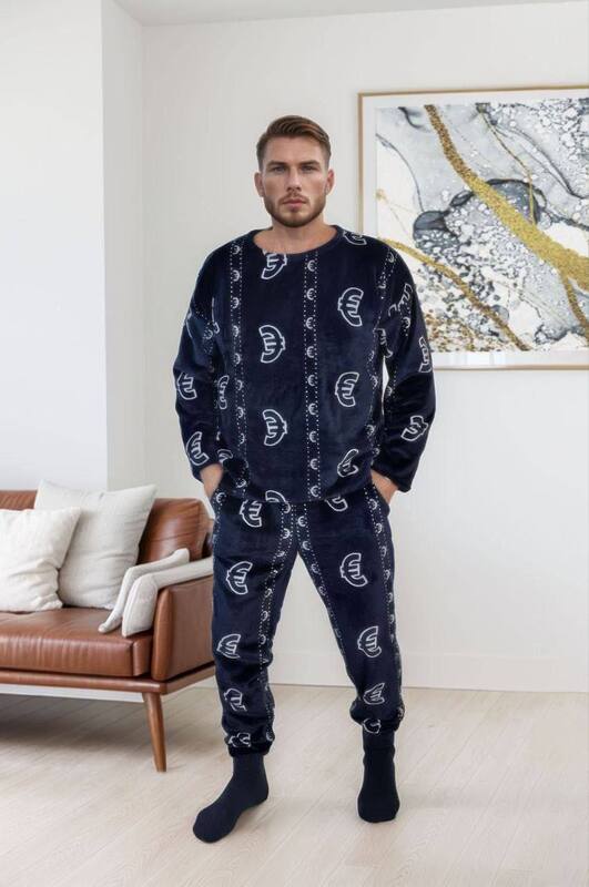 Мужская пижама из мягкого двустороннего плюша в тёмно-синем оттенке с контрастным узором — идеальный выбор для осеннего сезона. Ткань отличается приятной бархатистой поверхностью и высокой плотностью, что обеспечивает ощущение тепла и комфорта даже в прохладные вечера. Благодаря двусторонней структуре материал остаётся долговечным и сохраняет привлекательный внешний вид после многочисленных стирок.