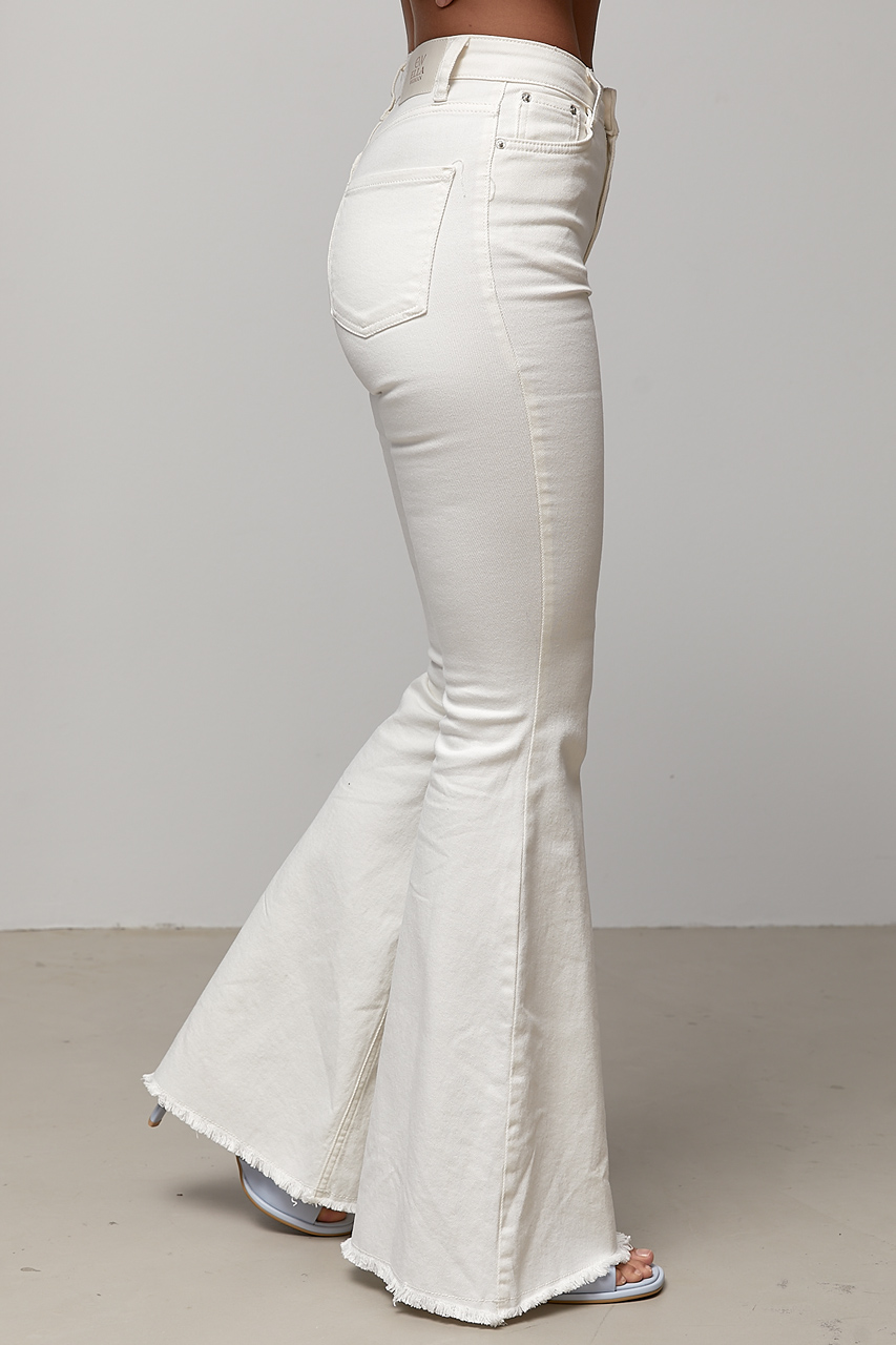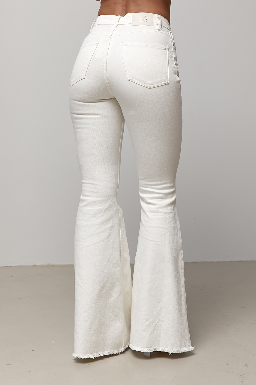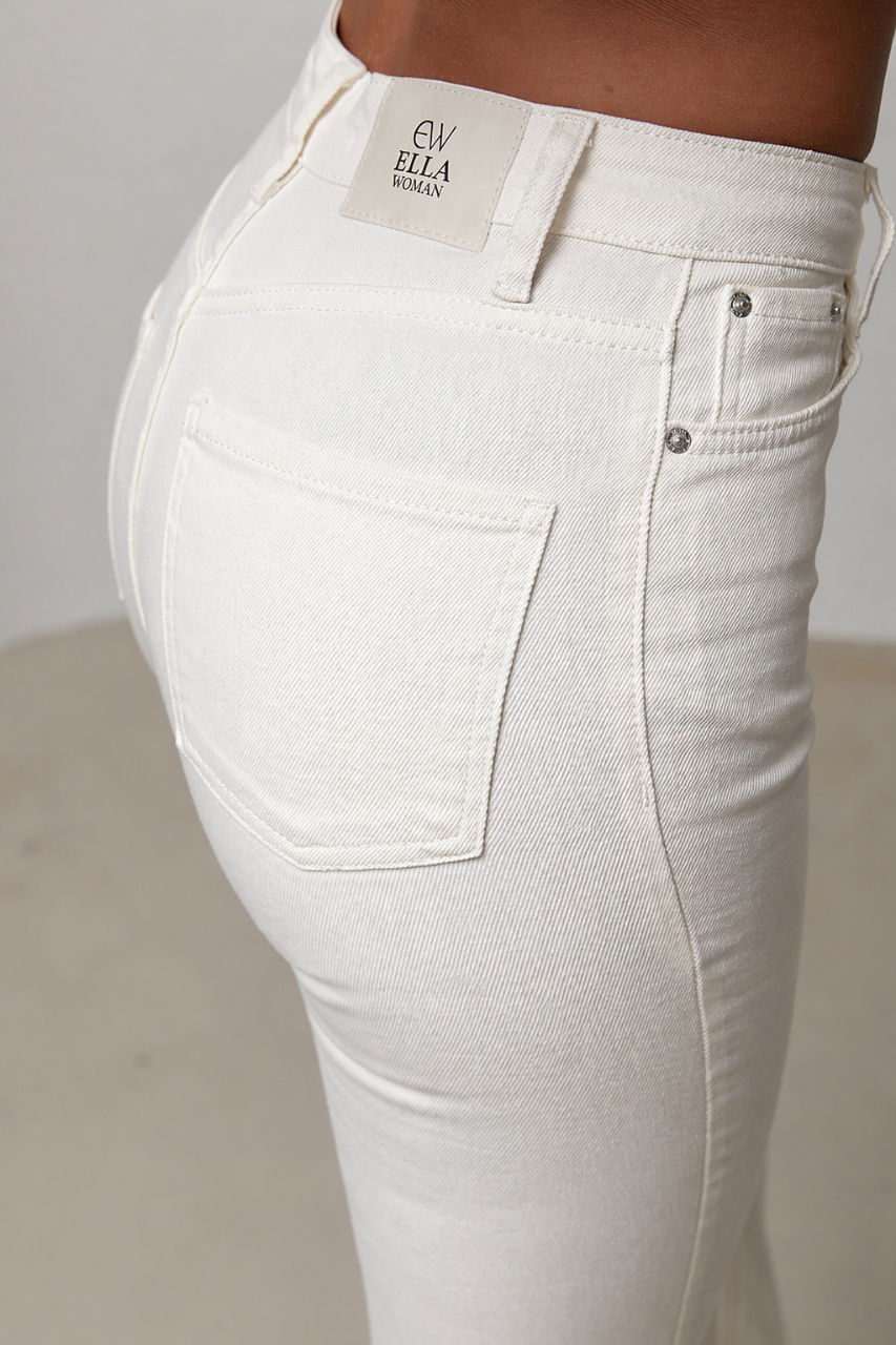 Джинси приталені по фігурі та розкльошуються від коліна, створюючи елегантний силует.
