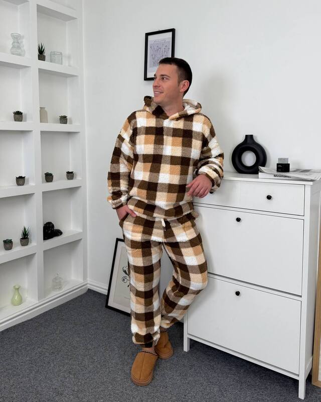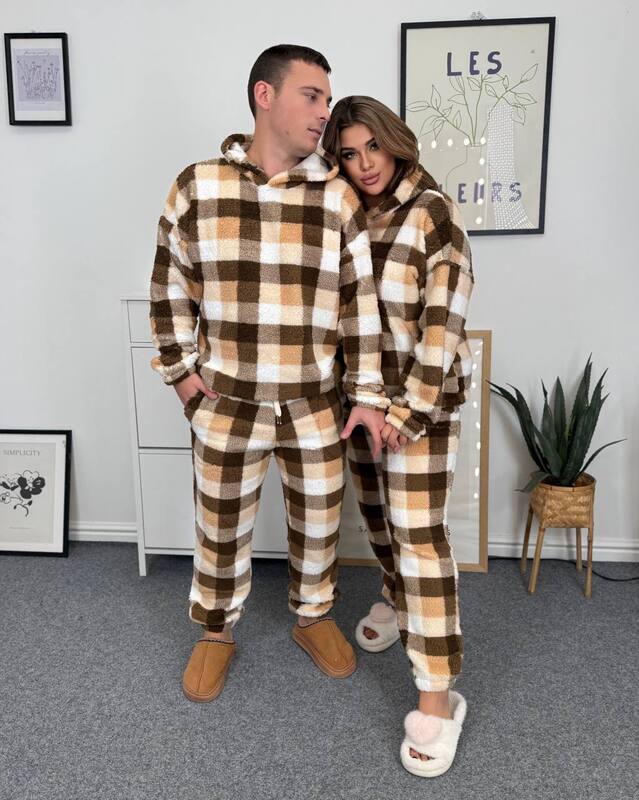 Унисекс-крой делает пижаму универсальной и подходящей как мужчинам, так и женщинам. Стильная крупная клетка добавляет образу выразительности, создаёт визуальный уют и подчёркивает мягкость материала. Такое сочетание свободного кроя, пушистой текстуры и тёплого принта прекрасно подходит как для парных образов, так и для домашнего комфорта в одиночестве.