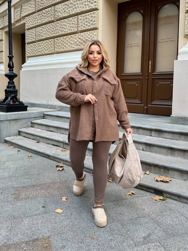 Тканина «еко-баранчик на флісі» має приємну фактуру, не скочується, не розтягується після прання і виглядає дорого. Вона чудово тримає форму, залишаючись при цьому м’якою і комфортною для шкіри. Приємний коричневий відтінок додає тепла образу та легко комбінується з базовими речами гардеробу — від класичних джинсів до спортивних лосин.