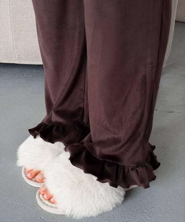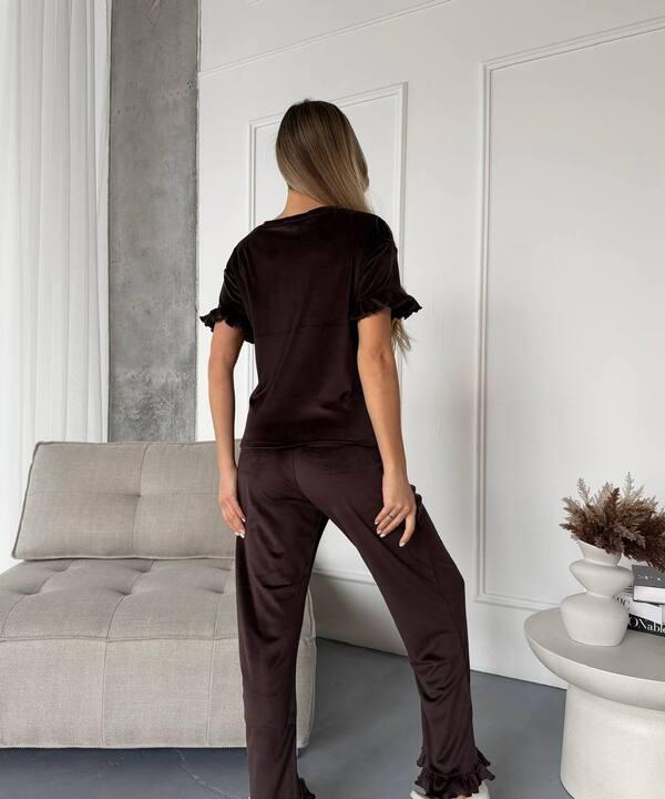 Отдельное внимание заслуживают декоративные детали. Аккуратные оборки по краю рукавов и по низу брюк делают модель более нежной, интересной и выразительной. За счёт этих элементов пижама выглядит не просто как базовая домашняя одежда, а как стильный комплект с женственным настроением. Она создаёт ощущение уюта и добавляет образу мягкости, что особенно важно для вещей, которые мы выбираем для отдыха и расслабления.