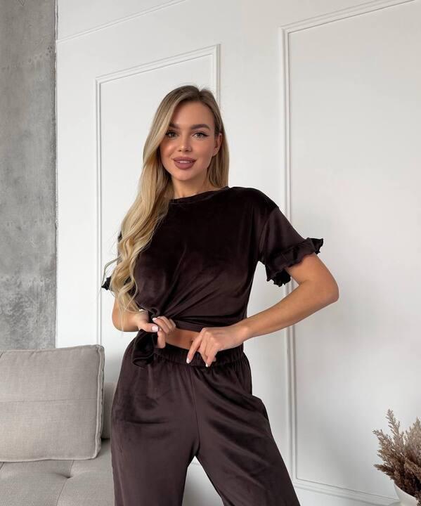 Комплект состоит из удобного верха с коротким рукавом и свободных брюк, благодаря чему образ смотрится гармонично и завершённо. Верх мягко ложится по фигуре, не сковывает движения и дарит ощущение лёгкости в течение всего дня. Короткий рукав делает модель удобной для дома и добавляет ей практичности. Брюки прямого свободного кроя красиво сидят, обеспечивают комфорт в движении и делают комплект особенно удобным для ежедневной носки. Такой фасон подходит тем, кто ценит свободу, мягкость и спокойную посадку без лишнего давления и дискомфорта.
