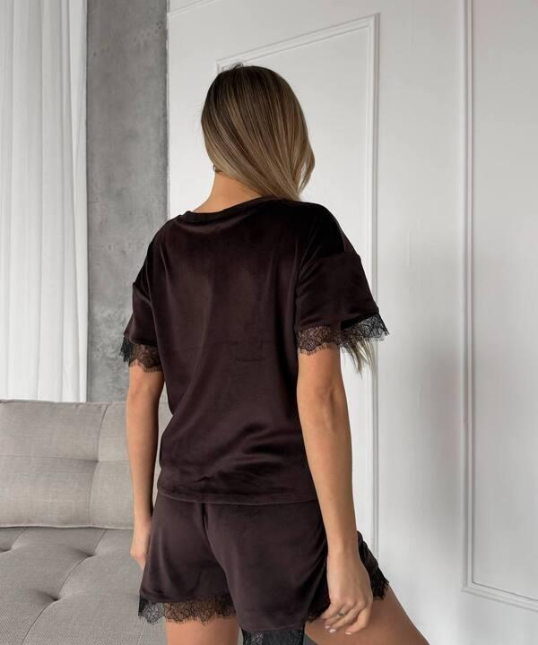 Пижама женская велюровая домашняя шорты и футболка с коротким рукавом и кружевной отделкой демисезонная k-128026