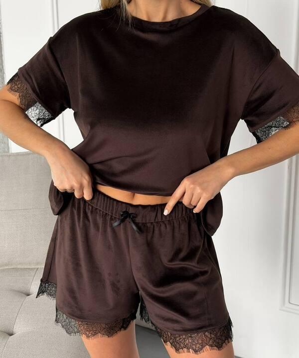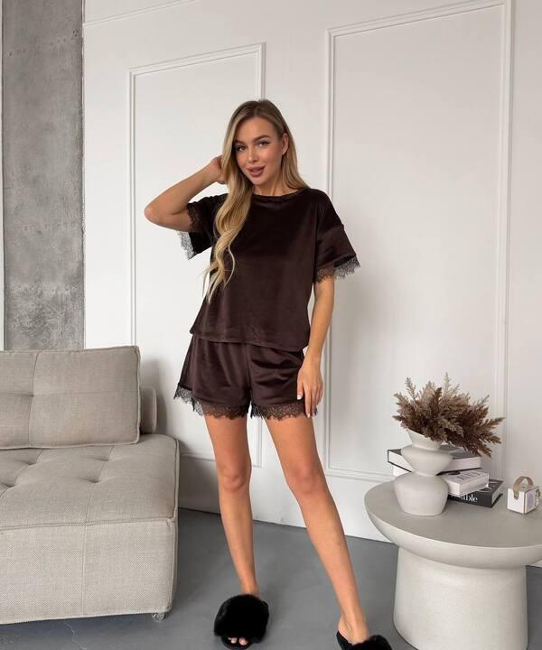Отзывы о Пижама женская велюровая домашняя шорты и футболка с коротким рукавом и кружевной отделкой демисезонная k-128026
