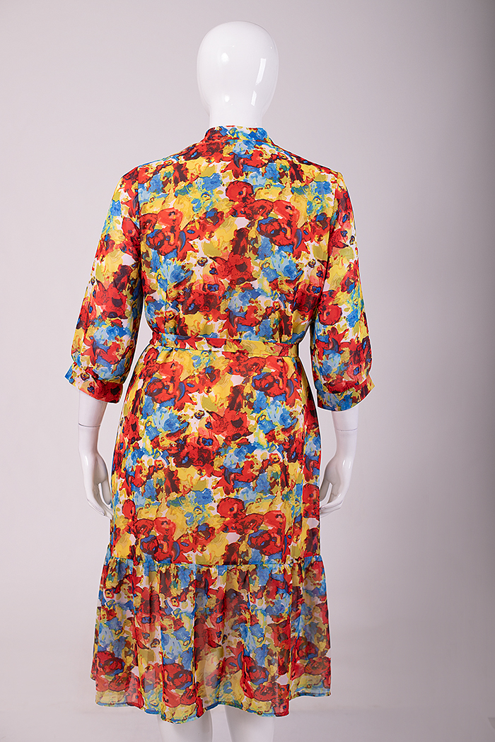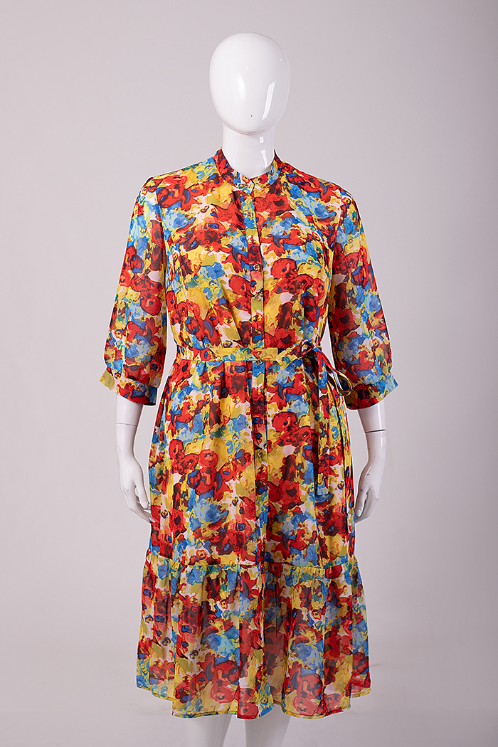 Платье из тонкого полотна на подкладке. Рукав ¾ на манжетах. Воротник – стойка. Застёжка донизу на планку с пуговицами. По низу изделия – оборка