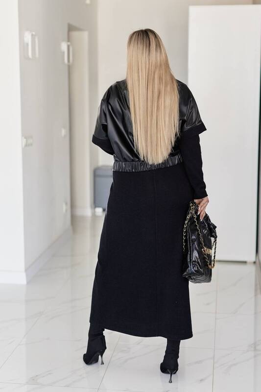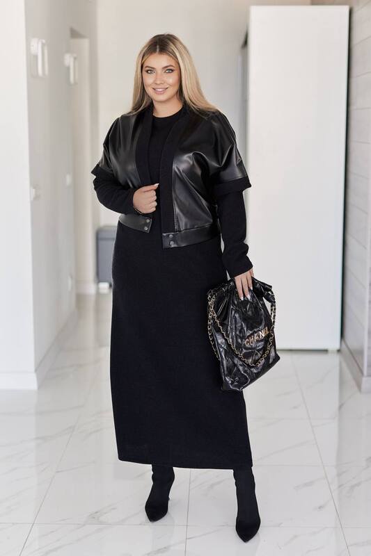 Комплект состоит из длинного трикотажного платья прямого кроя и укороченной жилетки из экокожи с модными акцентами. Такое решение позволяет носить вещи как вместе, так и отдельно, создавая разнообразные образы для повседневных прогулок, рабочих встреч или вечерних выходов.