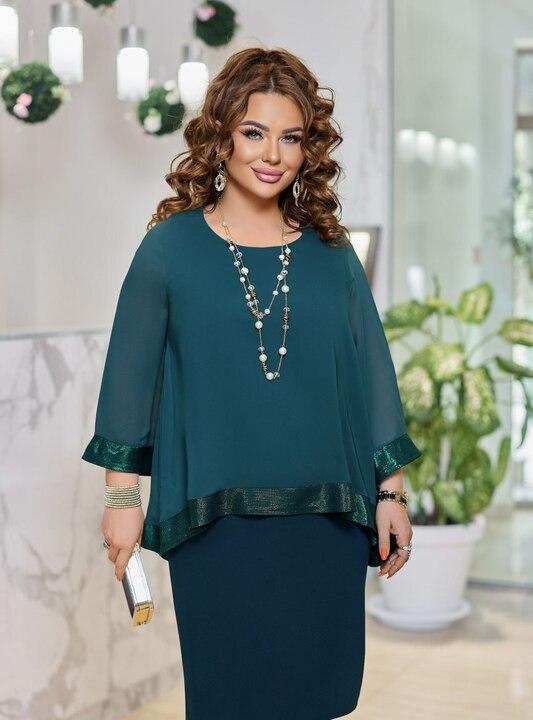 Особое внимание привлекает верхняя часть модели. Легкий шифон и декоративная отделка пайетками делают платье более выразительным, воздушным и нарядным. Цельнокроеный рукав длиной три четверти смотрится красиво, благородно и добавляет образу изящества. Верхний слой создает эффект легкости и делает силуэт визуально более интересным, за счет чего платье выглядит дорого и действительно празднично. Такие детали помогают модели выделяться и делают ее особенно привлекательной для женщин, которые любят красивую нарядную одежду с выразительными элементами.
