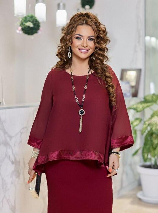 Особое внимание привлекает верхняя часть модели. Легкий шифон и декоративная отделка пайетками делают платье более выразительным, воздушным и нарядным. Цельнокроеный рукав длиной три четверти смотрится красиво, благородно и добавляет образу изящества. Верхний слой создает эффект легкости и делает силуэт визуально более интересным, за счет чего платье выглядит дорого и действительно празднично. Такие детали помогают модели выделяться и делают ее особенно привлекательной для женщин, которые любят красивую нарядную одежду с выразительными элементами.