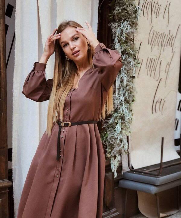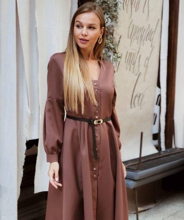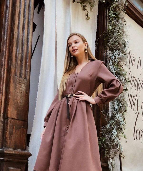 - По фото видно, что платье имеет красивый приталенный силуэт с легким расклешением книзу, благодаря чему образ получается женственным и мягким. Вертикальный ряд пуговиц визуально вытягивает силуэт, делает фигуру стройнее и добавляет модели аккуратный классический акцент. Отдельного внимания заслуживает пояс: он идет отдельно, позволяет красиво подчеркнуть талию и менять настроение образа в зависимости от желаемой посадки. С поясом платье выглядит более собранно и выразительно, а без него может смотреться свободнее и расслабленнее.