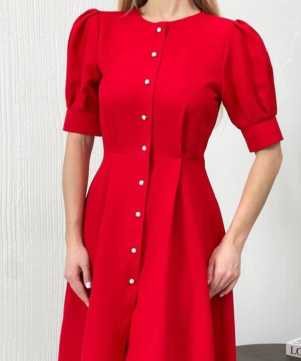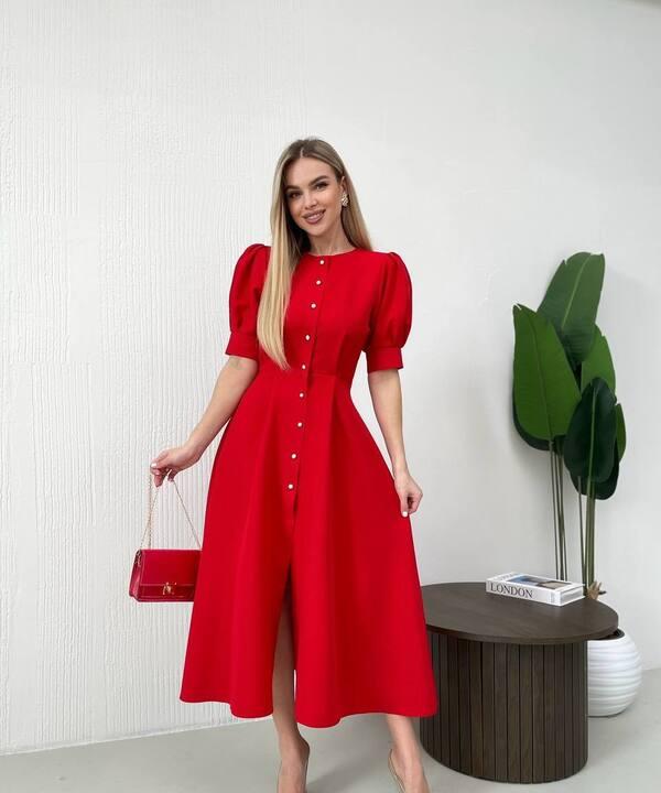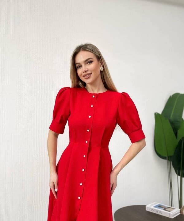 Фасон построен так, чтобы сочетать комфорт и эффектную подачу. Приталенная линия делает акцент на талии, расклешенный низ добавляет легкости и плавности движения, а длина миди подчеркивает женственность и визуально вытягивает силуэт. Аккуратные рукава с мягким объемом делают образ более нежным и утонченным. Вертикальная линия декоративных пуговиц с имитацией жемчуга добавляет изысканную деталь, которая делает модель более интересной и завершенной. Разрез по передней части добавляет динамики и делает походку еще более красивой.