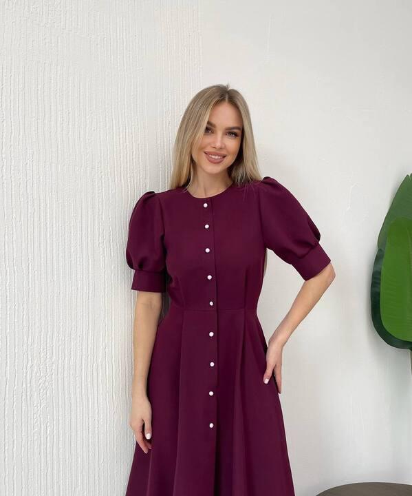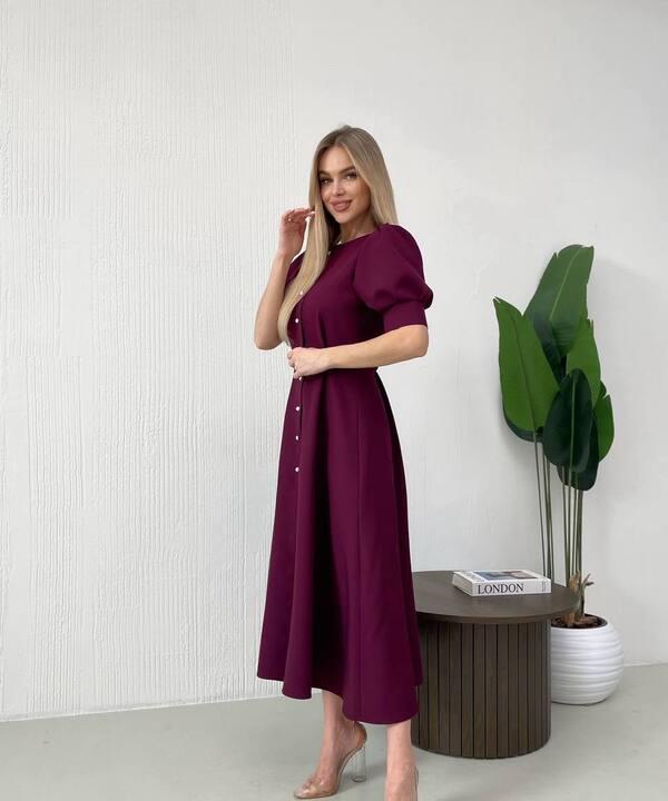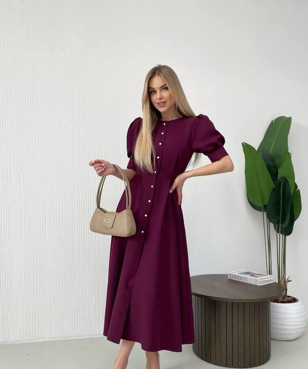 Отдельного внимания заслуживает крой. Верхняя часть оформлена лаконично и женственно, а аккуратные рукава с объемом делают образ более мягким и изящным. Вертикальная линия декоративных пуговиц с имитацией жемчуга визуально вытягивает силуэт и создает красивый акцент по центру изделия. Разрез в нижней части добавляет модели динамики, делает походку более легкой и подчеркивает красоту длины миди. Такое сочетание деталей делает платье выразительным, но при этом не перегруженным.