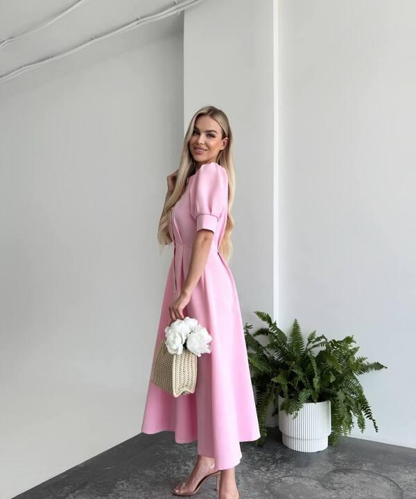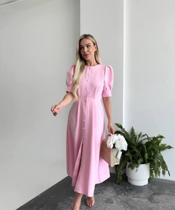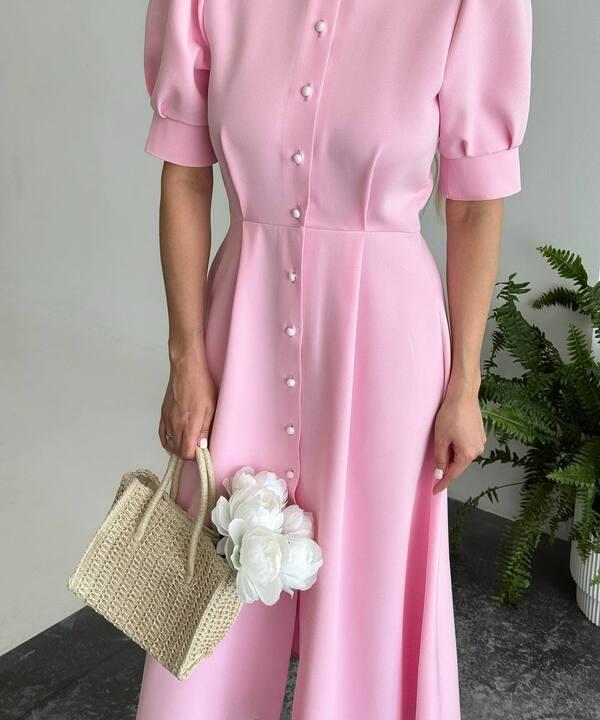 Особую привлекательность модели придает вертикальная линия декоративных пуговиц с имитацией жемчуга. Такая деталь делает платье более изысканным, визуально вытягивает силуэт и добавляет образу мягкую нарядность. Рукава с объемом выглядят очень женственно, делают фасон более актуальным и придают образу утонченность. Длина миди смотрится благородно и универсально, а разрез в нижней части добавляет легкую динамику, делает шаг свободнее и подчеркивает красоту общего силуэта.