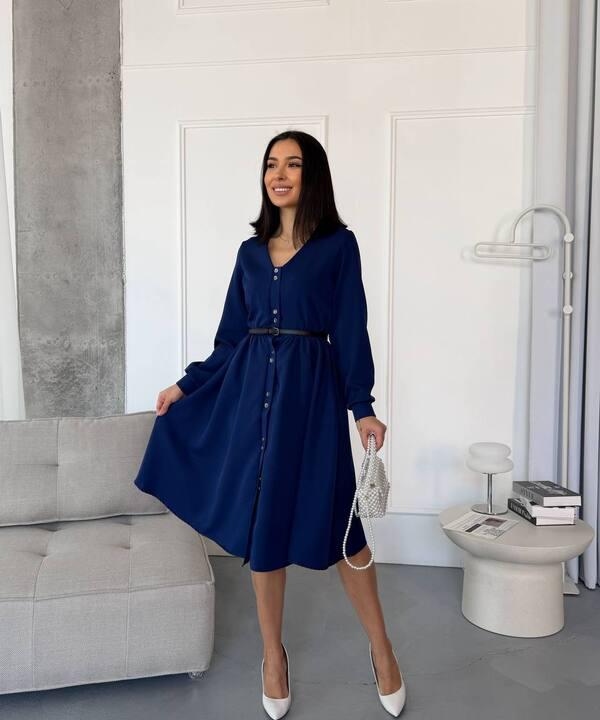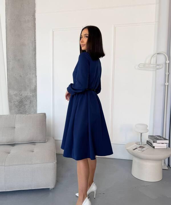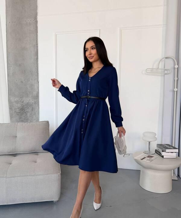 Силуэт у модели мягкий, женственный и слегка расклешенный к низу, благодаря чему платье красиво движется при ходьбе и создает особенно изящное впечатление. Линия талии оформлена на резинке, поэтому посадка получается комфортной и при этом помогает подчеркнуть фигуру. Длинные рукава делают модель более универсальной и завершенной, а общая длина смотрится элегантно и уместно в самых разных ситуациях. Дополнительно образ можно подчеркнуть поясом, который делает силуэт еще более выразительным и собранным.