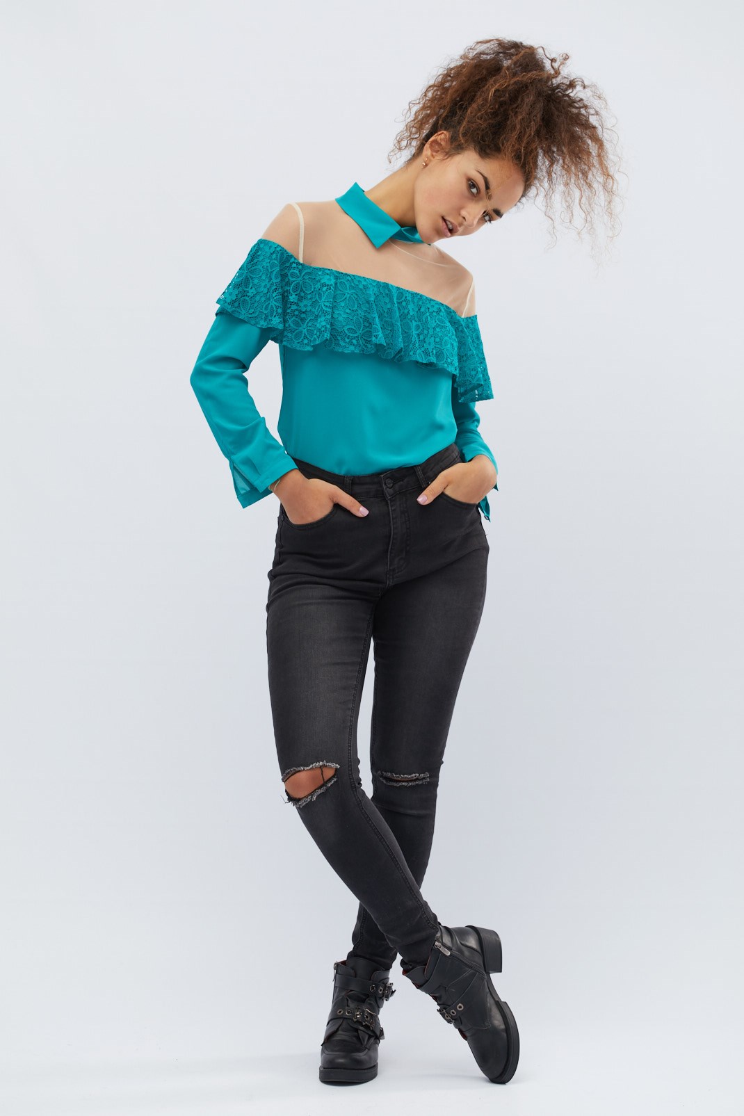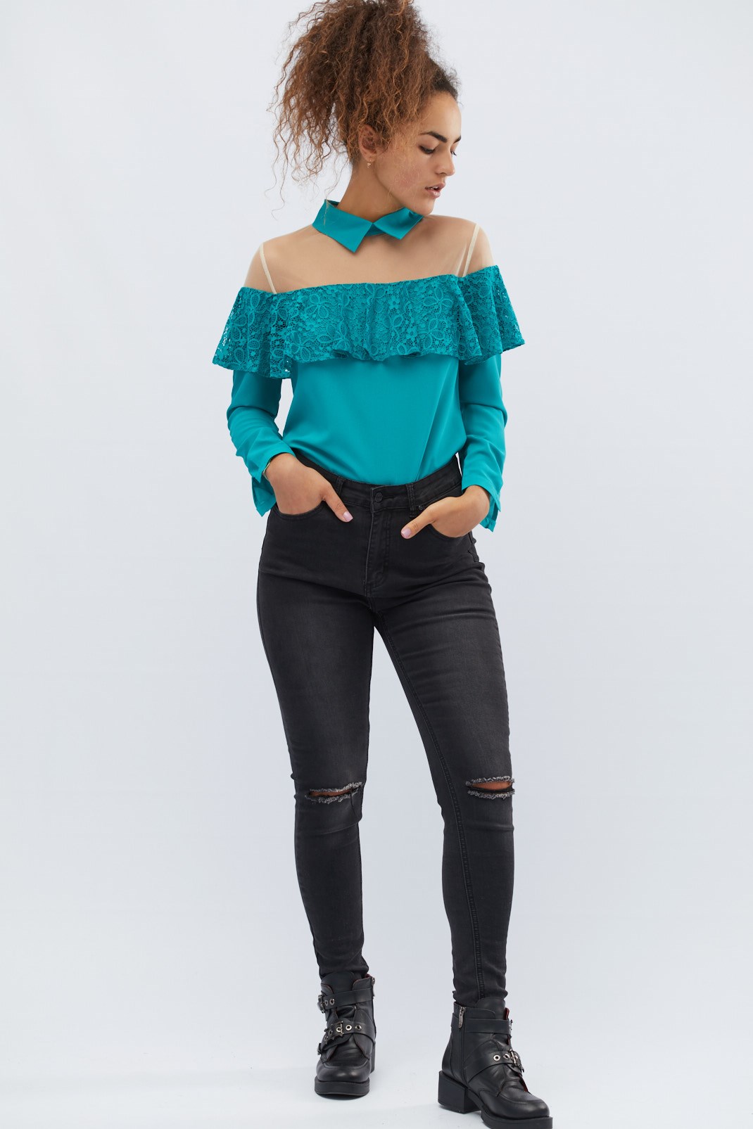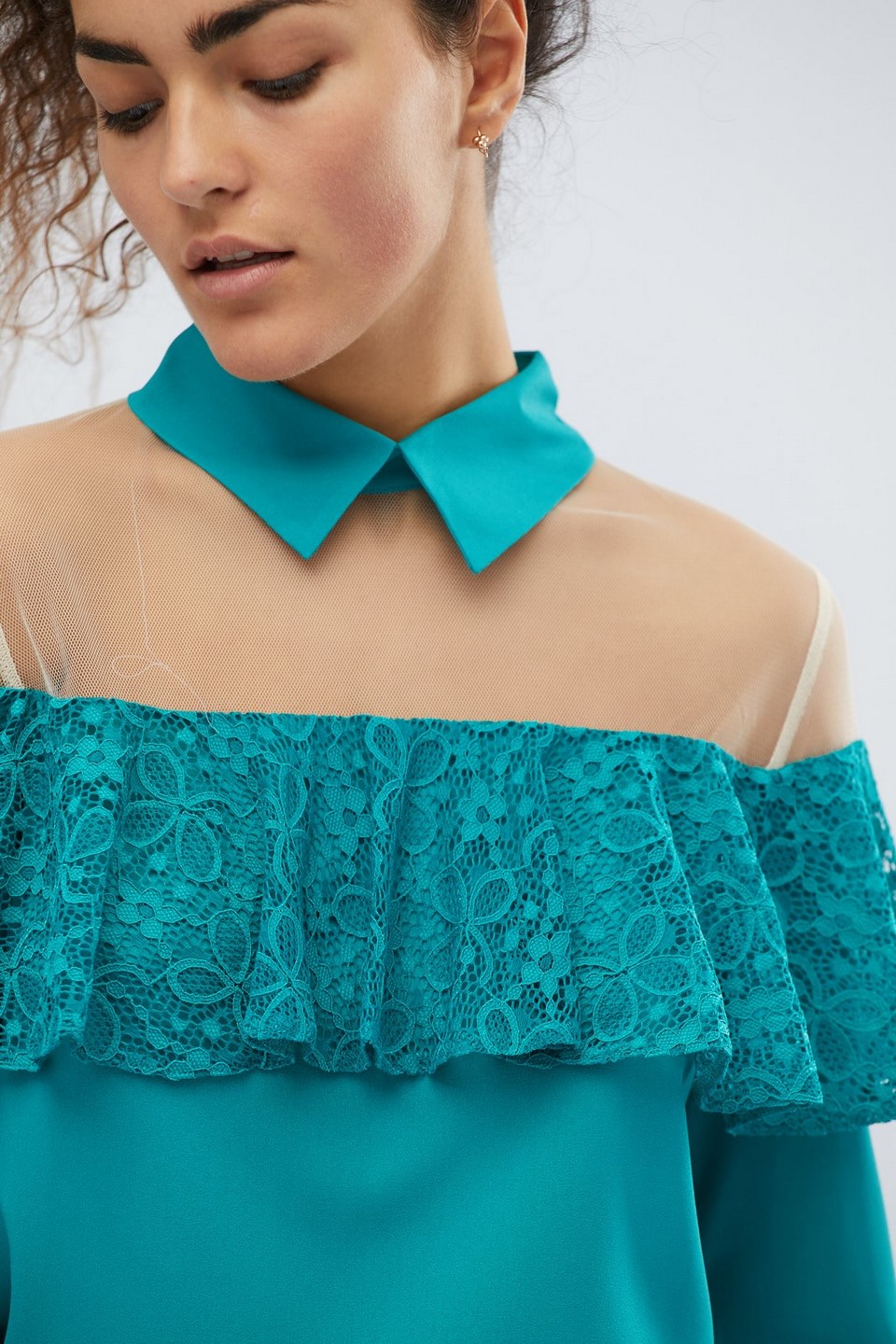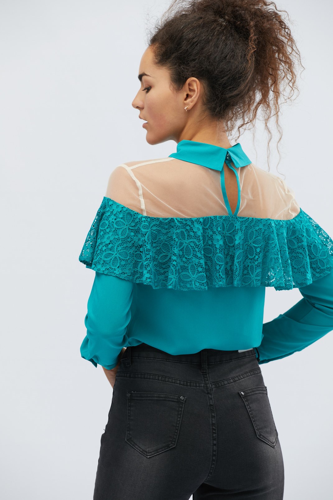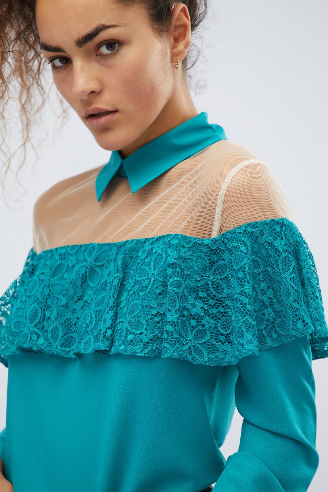 Доступные размеры :[XS] Размер XS:Рост модели:175 смРоскошная блузка с декоративной сеткой. Верх блузки украшен рюшами. Воротничок стойка. Длинные рукава длинные. Застегивается на капельку на спине. Отлично сочетается с джинсами или брюками с высокой.. Читать полностью