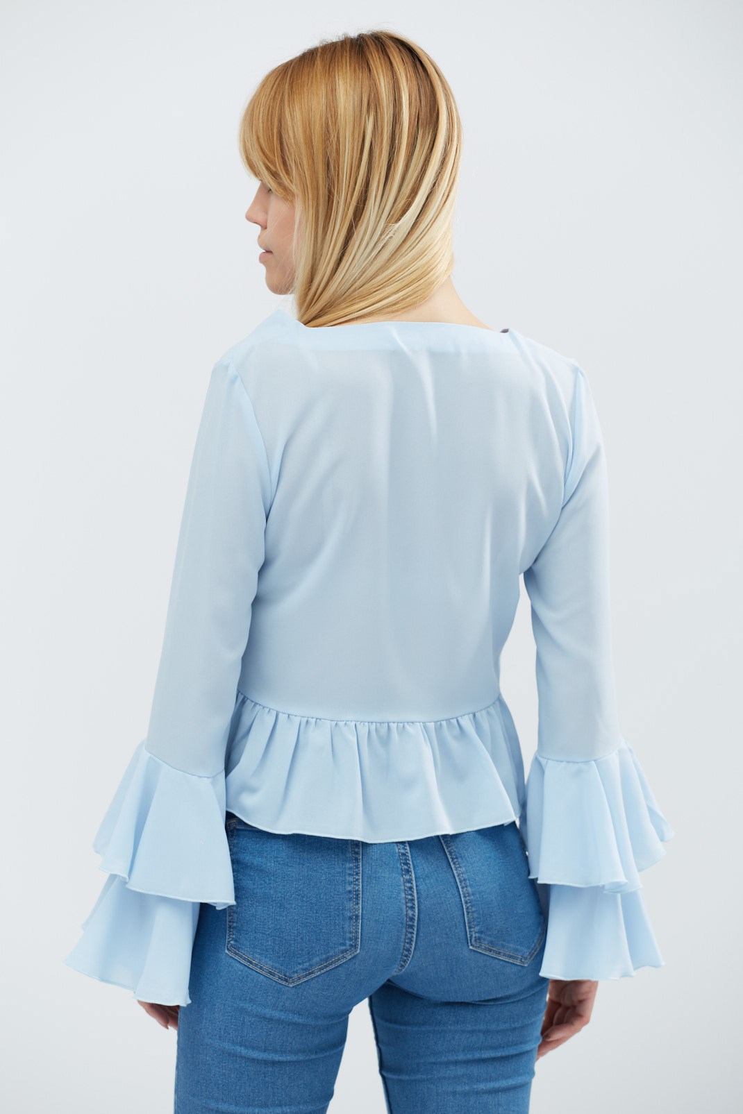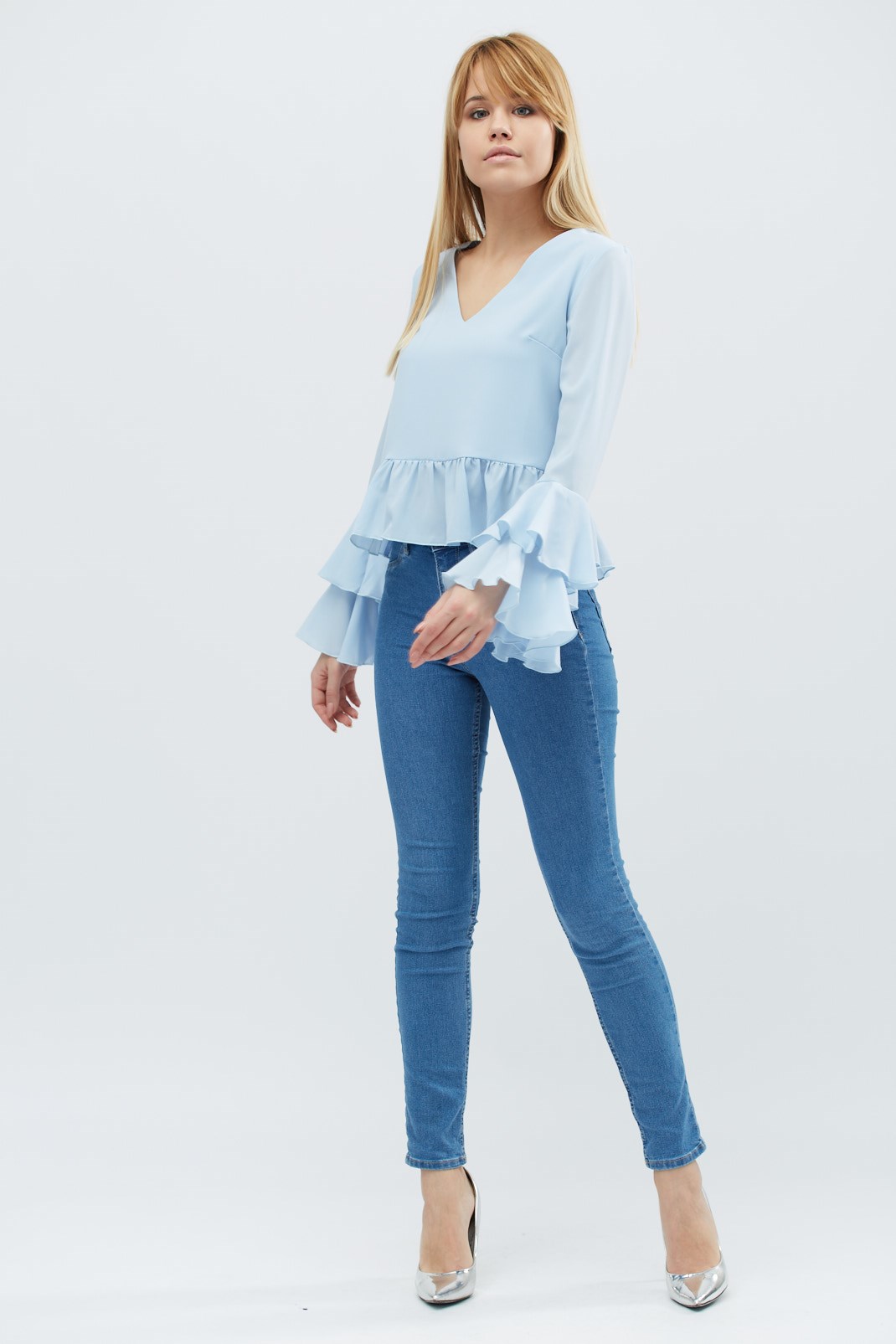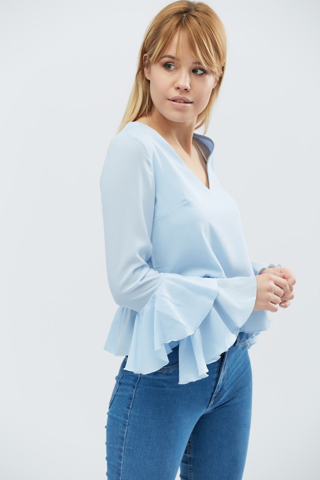 Доступные размеры :[S] Размер S:Рост модели:169 смДлина изделия:50Длина плеча:8Длина рукава:56Обхват груди:90Ширина плечей:36Однотонная приталенная блуза. V-образный вырез. Длинные рукава и линия низа украшены рюшами. Отлично сочетается как с джинсам.. Читать полностью