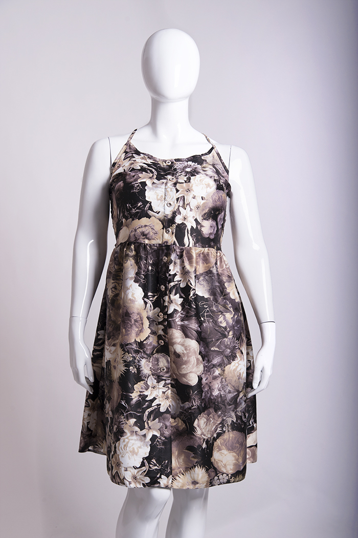 Легкий сарафан приталенного силуэта, на бретелях. Спереди имитация застёжки на пуговицы. Бретели можно отрегулировать по длине. Верх спинки до талии собран на резинку «венгерка» в несколько рядов