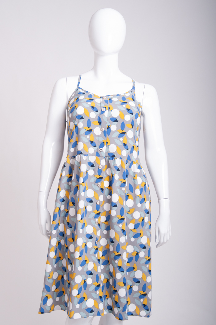 Легкий сарафан приталенного силуэта, на бретелях. Спереди имитация застёжки на пуговицы. Бретели можно отрегулировать по длине. Верх спинки до талии собран на резинку «венгерка» в несколько рядов