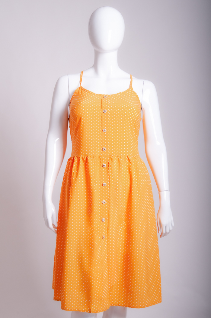 Легкий сарафан приталенного силуэта, на бретелях. Спереди имитация застёжки на пуговицы. Бретели можно отрегулировать по длине. Верх спинки до талии собран на резинку «венгерка» в несколько рядов