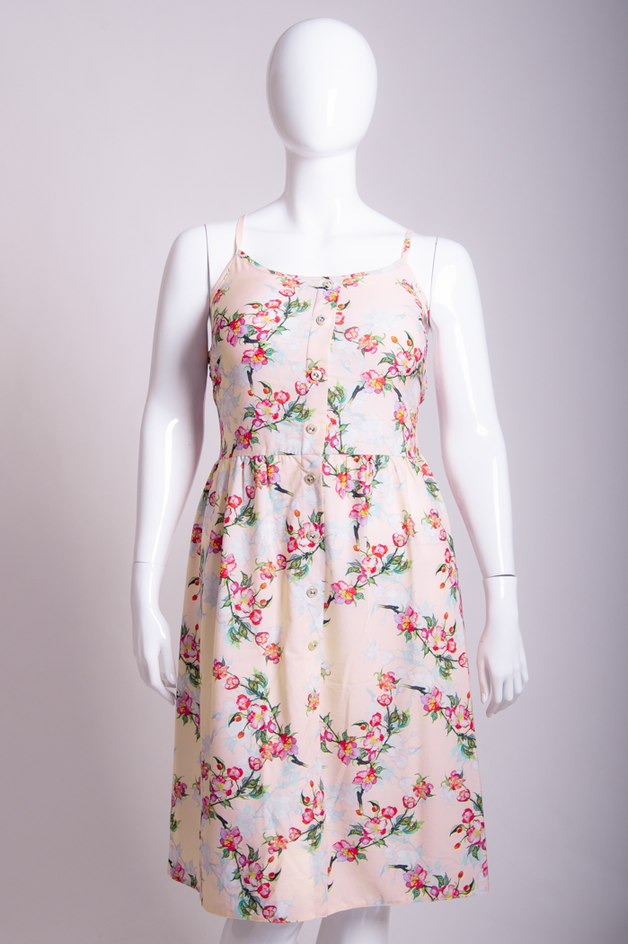 Легкий сарафан приталенного силуэта, на бретелях. Спереди имитация застёжки на пуговицы. Бретели можно отрегулировать по длине. Верх спинки до талии собран на резинку «венгерка» в несколько рядов