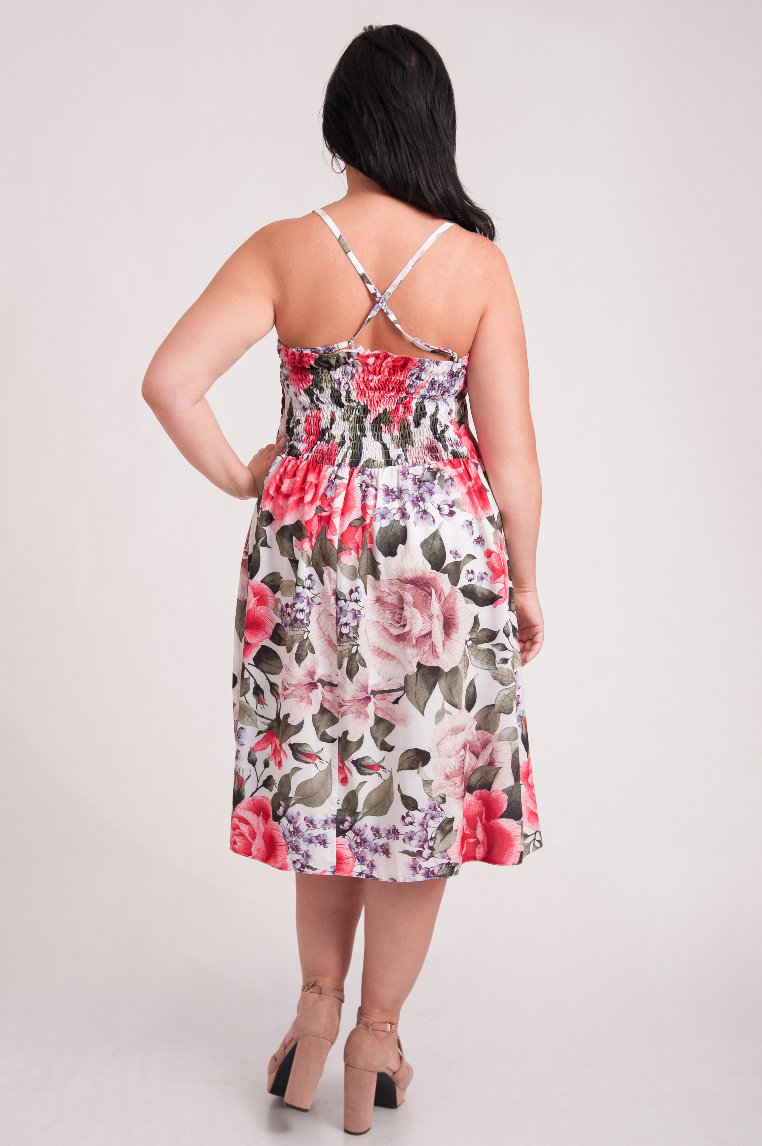 Легкий сарафан приталенного силуэта, на бретелях. Спереди имитация застёжки на пуговицы. Бретели можно отрегулировать по длине. Верх спинки до талии собран на резинку «венгерка» в несколько рядов