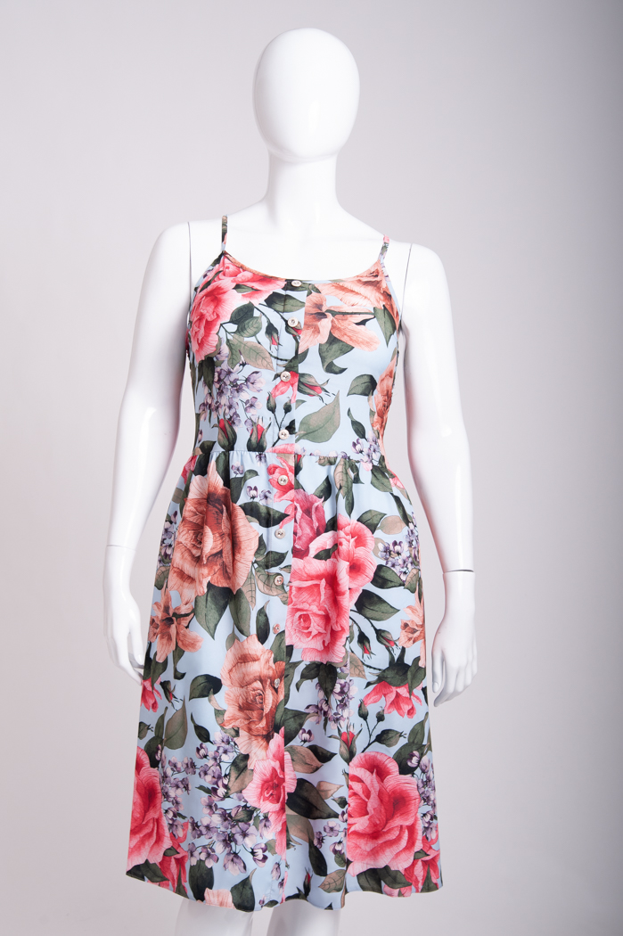 Легкий сарафан приталенного силуэта, на бретелях. Спереди имитация застёжки на пуговицы. Бретели можно отрегулировать по длине. Верх спинки до талии собран на резинку «венгерка» в несколько рядов