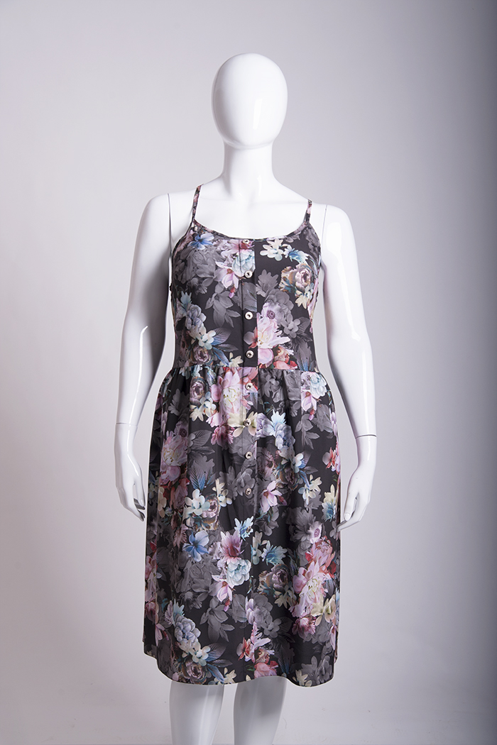 Легкий сарафан приталенного силуэта, на бретелях. Спереди имитация застёжки на пуговицы. Бретели можно отрегулировать по длине. Верх спинки до талии собран на резинку «венгерка» в несколько рядов