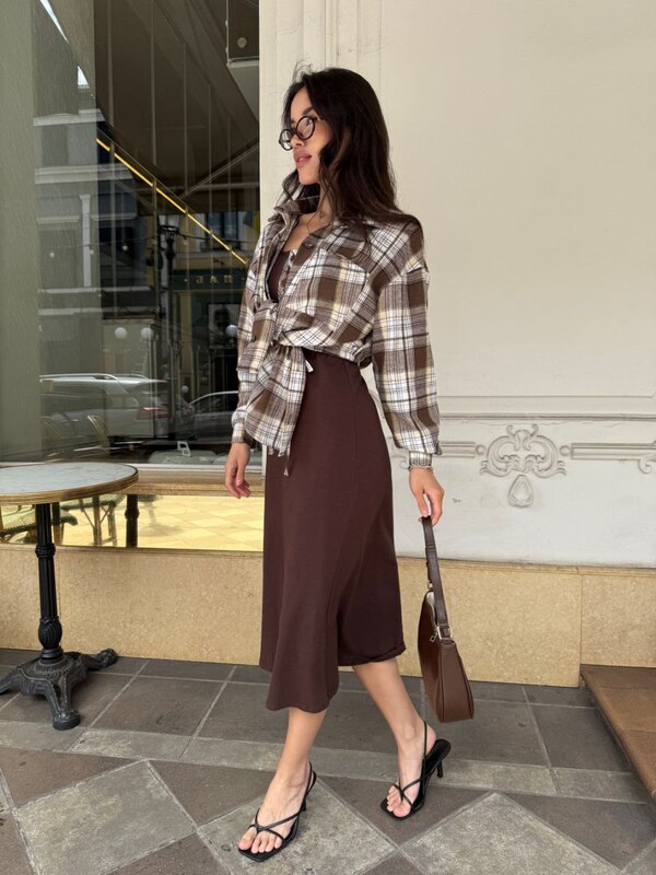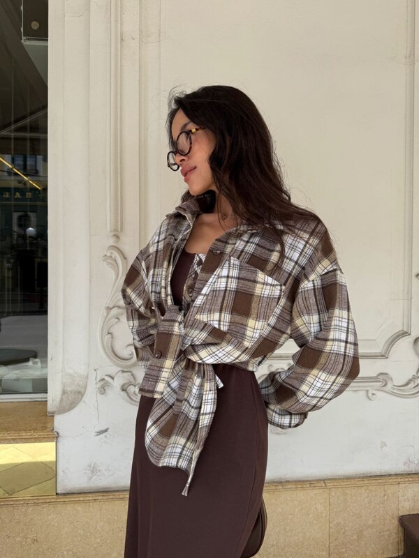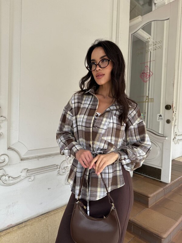 Рубашка из теплой турецкой фланели выполнена в трендовом клетчатом принте и дополняет платье, создавая многослойный ансамбль. Благодаря свободному крою она обеспечивает комфорт и отлично сочетается не только с платьем, но и с джинсами, брюками или юбками. Кулиска по низу рубашки позволяет регулировать посадку, создавать разные стили и подчеркивать талию по желанию. Этот элемент делает модель особенно универсальной и функциональной.