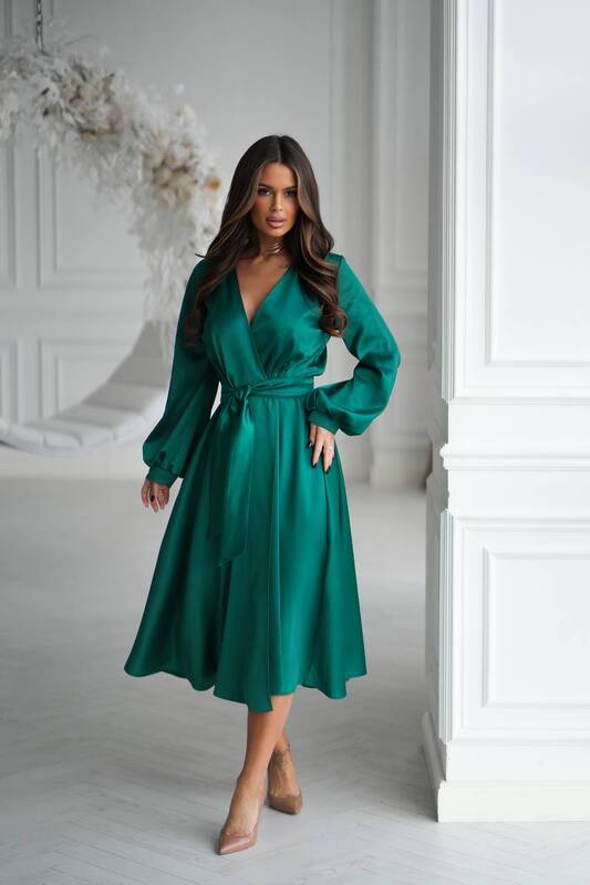 Платье на запах женское атласное миди с поясом и длинными рукавами из ткани Скарлет осенне-зимнее зелёное  k-125194