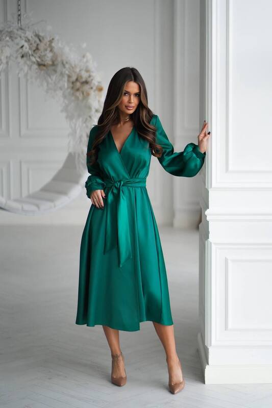 Отзывы о Платье на запах женское атласное миди с поясом и длинными рукавами из ткани Скарлет осенне-зимнее зелёное k-125194