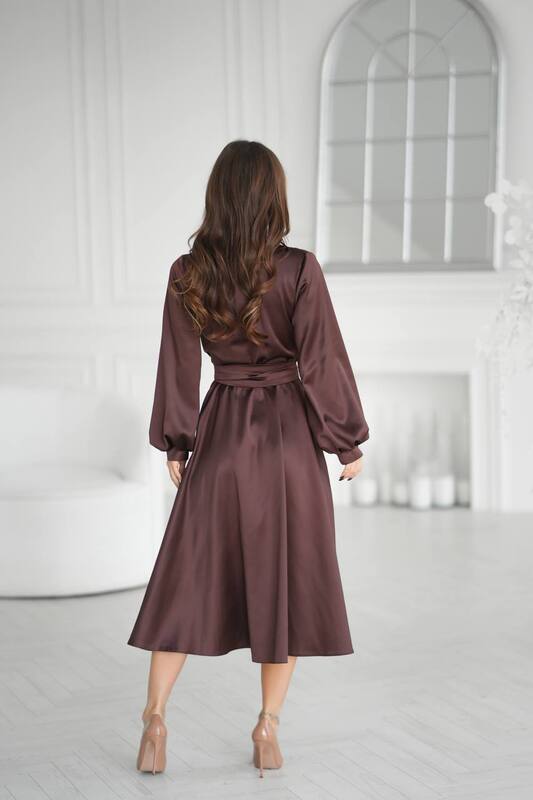 Платье на запах женское атласное миди с поясом и длинными рукавами из ткани Скарлет осенне-зимнее шоколадное k-125198