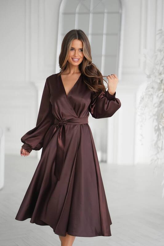 Отзывы о Платье на запах женское атласное миди с поясом и длинными рукавами из ткани Скарлет осенне-зимнее шоколадное k-125198