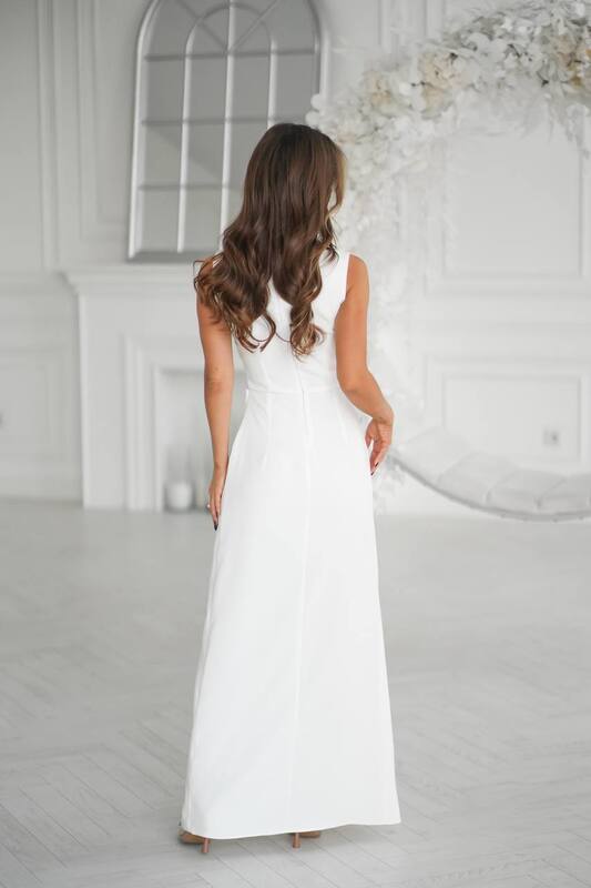 Элегантное длинное платье в белом цвете — это воплощение роскоши, утончённости и женственности. Модель выполнена из гладкой костюмной ткани премиального качества, которая красиво ложится по фигуре, подчёркивая силуэт и придавая образу изысканности. Особое внимание привлекает роскошная вставка из мерцающего кружева с глиттером, проходящая вдоль высокого разреза, добавляя загадочности и соблазна.