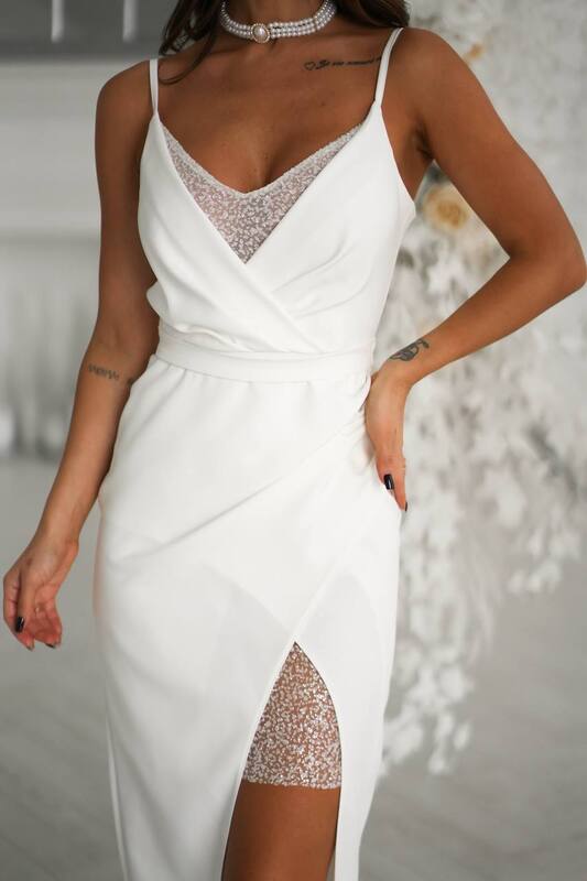 Роскошное женское платье-комбинация в белом цвете — воплощение утончённой элегантности и женственности. Оно создано для особых случаев, когда хочется сиять и выглядеть безупречно. Модель выполнена из качественной костюмной ткани, дополненной вставками из кружевного глиттера, который изящно переливается при свете, придавая образу праздничное очарование.