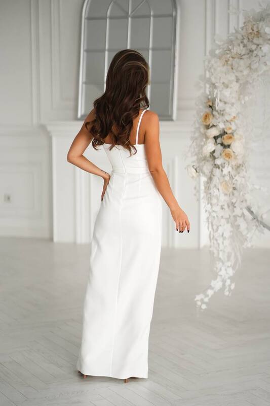 Белый цвет делает платье особенно универсальным и нарядным — оно подойдёт как для выпускного вечера, так и для торжества, фотосессии, свадьбы или романтического ужина. Лаконичный дизайн позволяет сочетать его с обувью на каблуке, клатчем и утончёнными аксессуарами, создавая образ с безупречным вкусом.