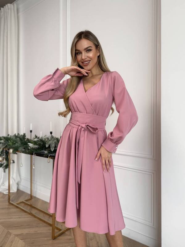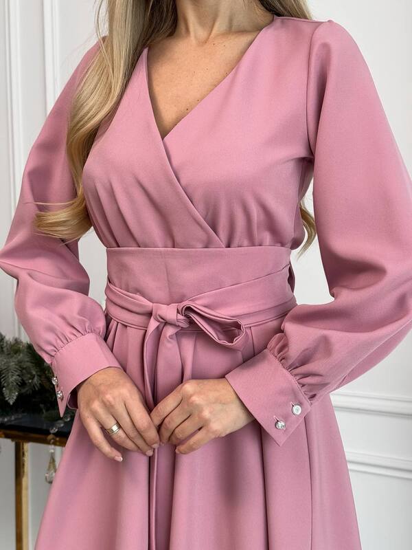 Ключевым элементом модели является декольте с имитацией запаха. Такой приём визуально вытягивает силуэт, подчёркивает линию груди и добавляет образу утончённости. Имитация запаха смотрится аккуратно и эстетично, создавая красивый акцент без излишней откровенности. Линия талии подчёркнута поясом, который помогает сформировать женственные пропорции и позволяет регулировать посадку по фигуре.