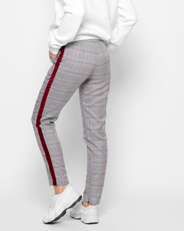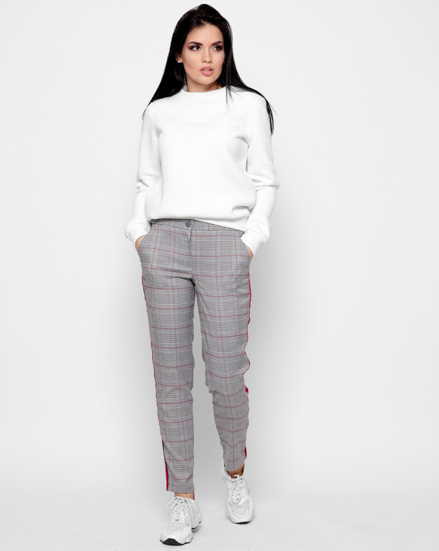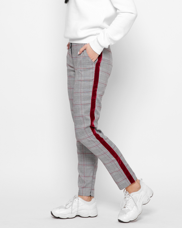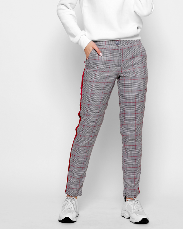 Стильные брюки в трендовую клетку. Средняя посадка и зауженный силуэт подчеркнет форму ног и талию. Застежка на пуговицу и молнию. Два кармана спереди. По бокам модные красные лампасы. Снизу декоративные молнии.