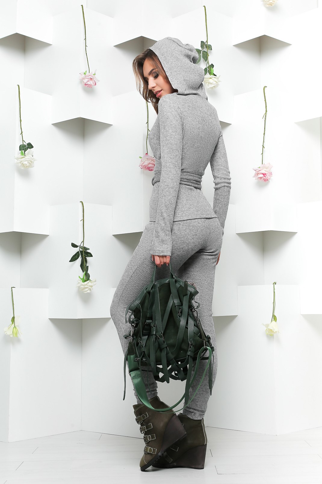 Модный костюм из теплого материала. Зауженная кофта с запАхом. V-образный вырез, цельный капюшон, длинные рукава. На талии пояс в тон. Зауженные брюки на кулисе с карманами.