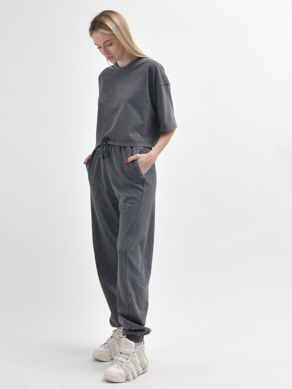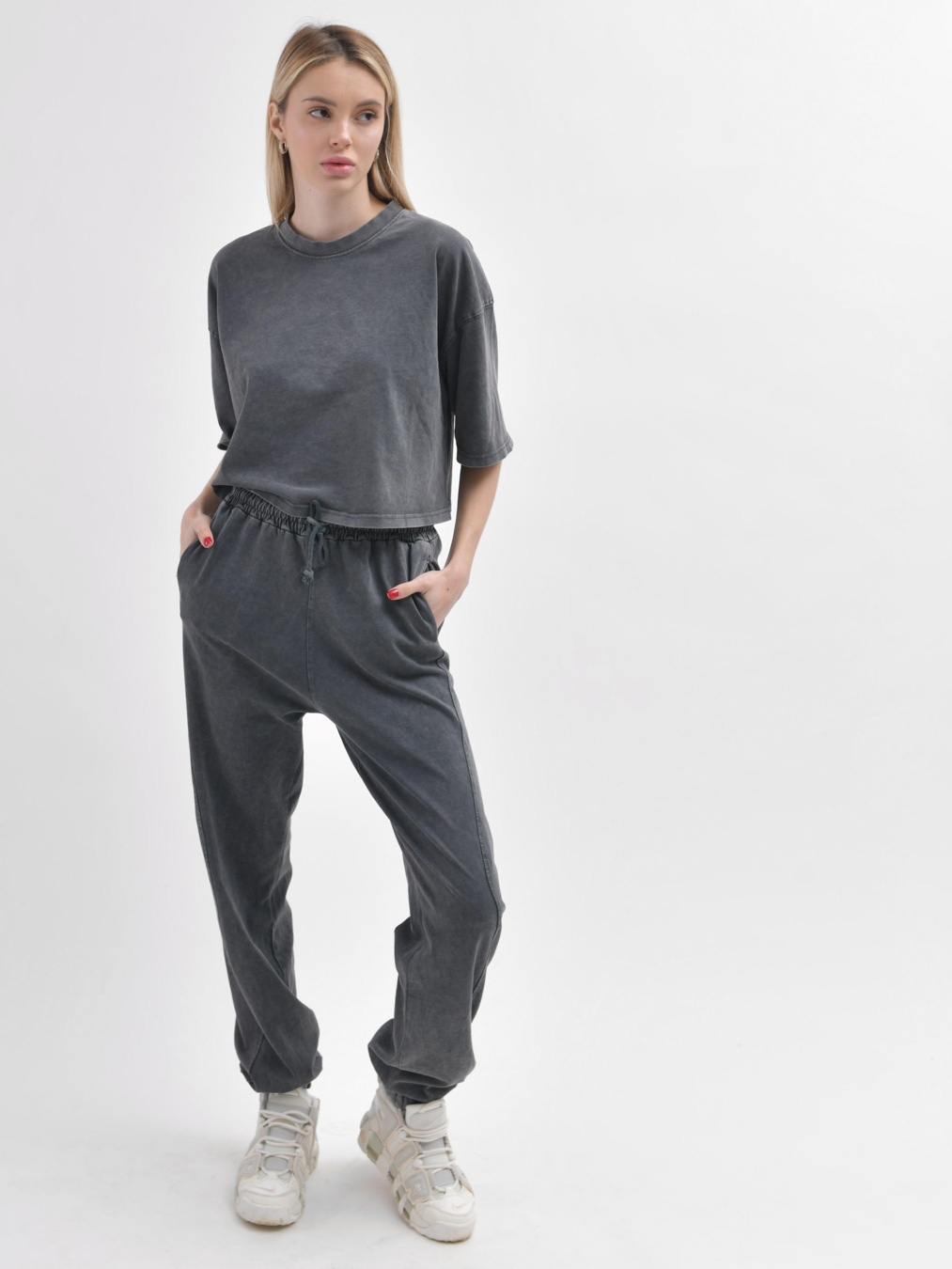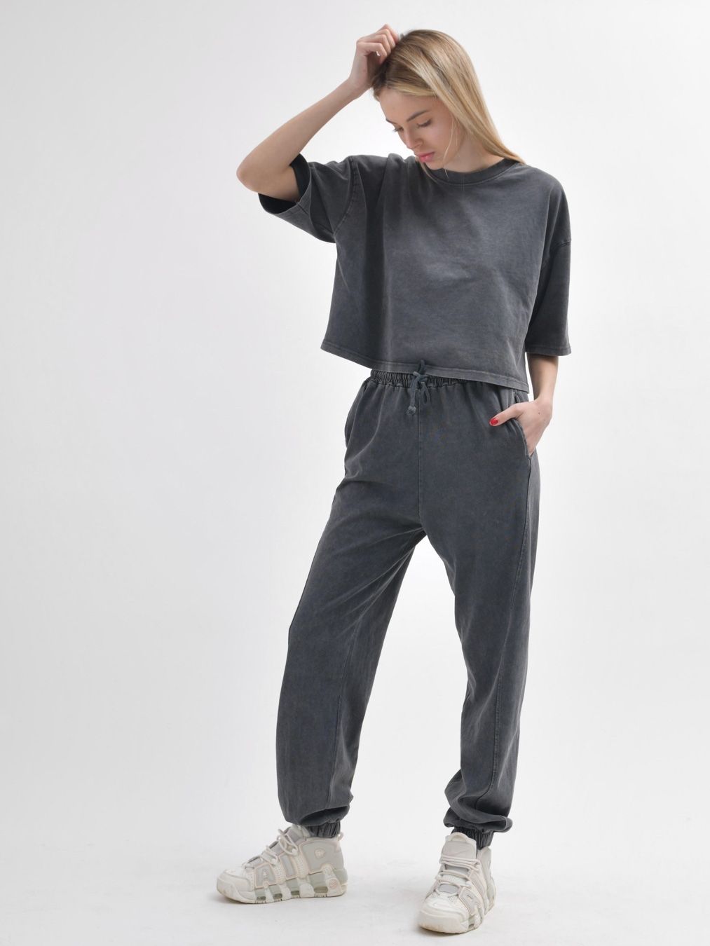 Этот стильный комплект включает в себя кроп-топ и штаны. Кроп-топ с удлиненными рукавами и спущенной линией плеча придает непринужденный вид, а круглый вырез подчеркивает изящество образа. Брюки удобно сидят на талии благодаря эластичной резинке и завязкам, а манжеты на штанинах придают завершенность стилю....