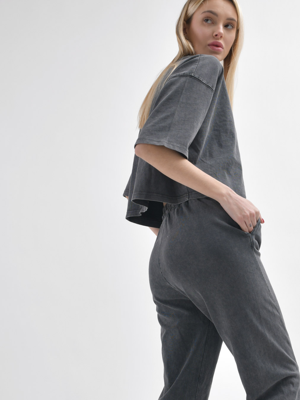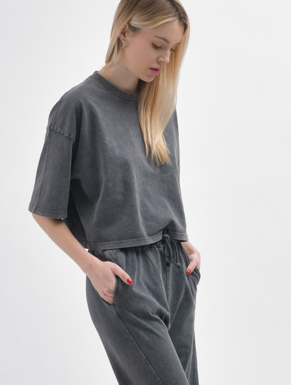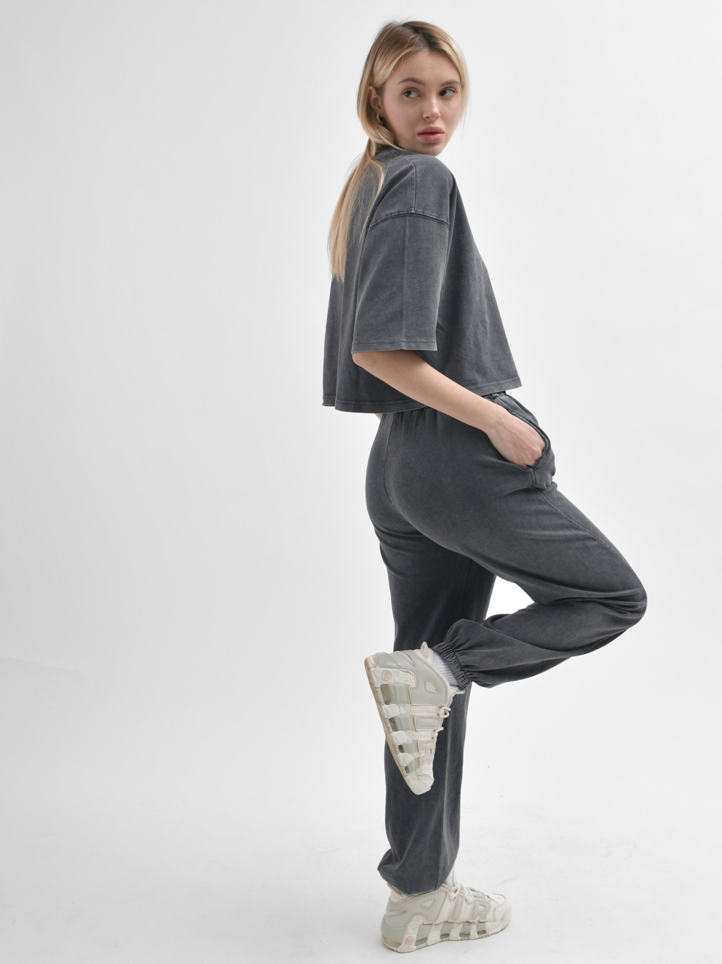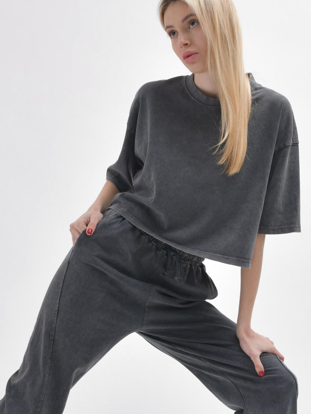 Этот стильный комплект включает в себя кроп-топ и штаны. Кроп-топ с удлиненными рукавами и спущенной линией плеча придает непринужденный вид, а круглый вырез подчеркивает изящество образа. Брюки удобно сидят на талии благодаря эластичной резинке и завязкам, а манжеты на штанинах придают завершенность стилю....
