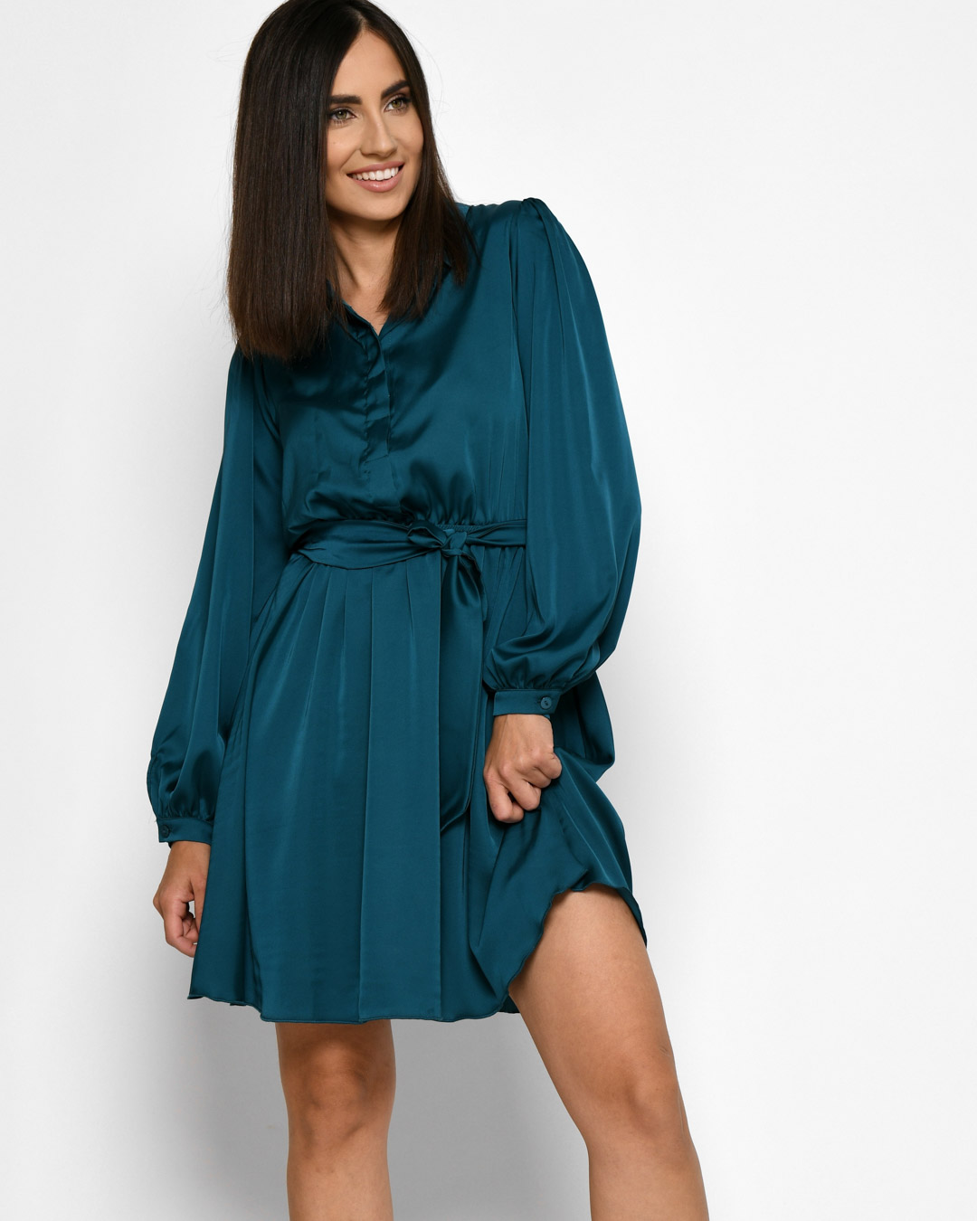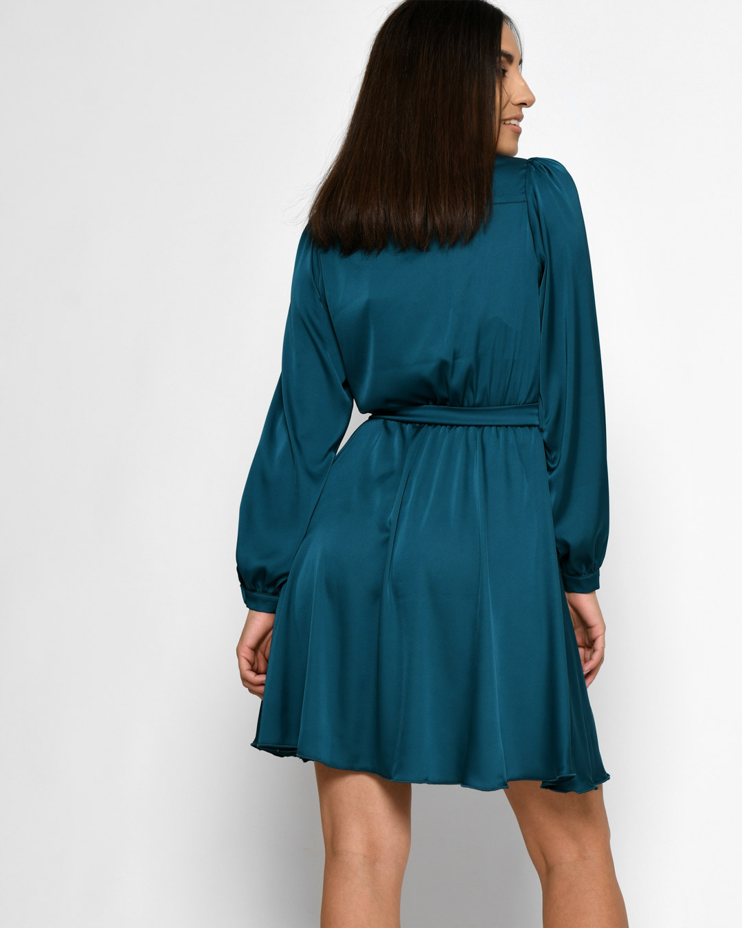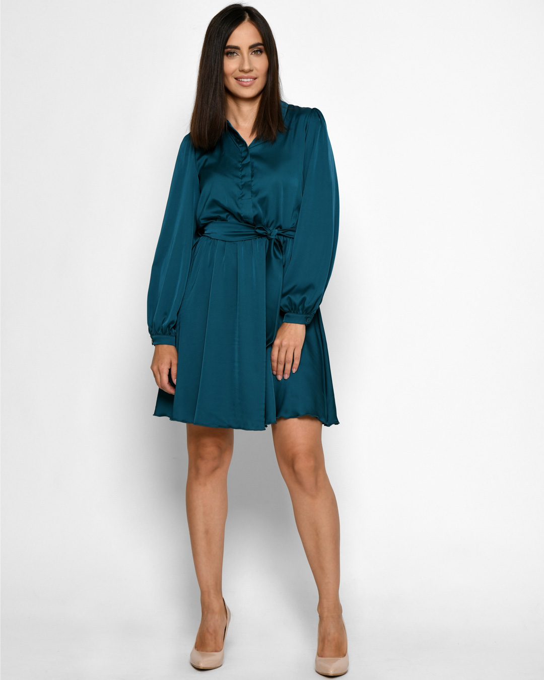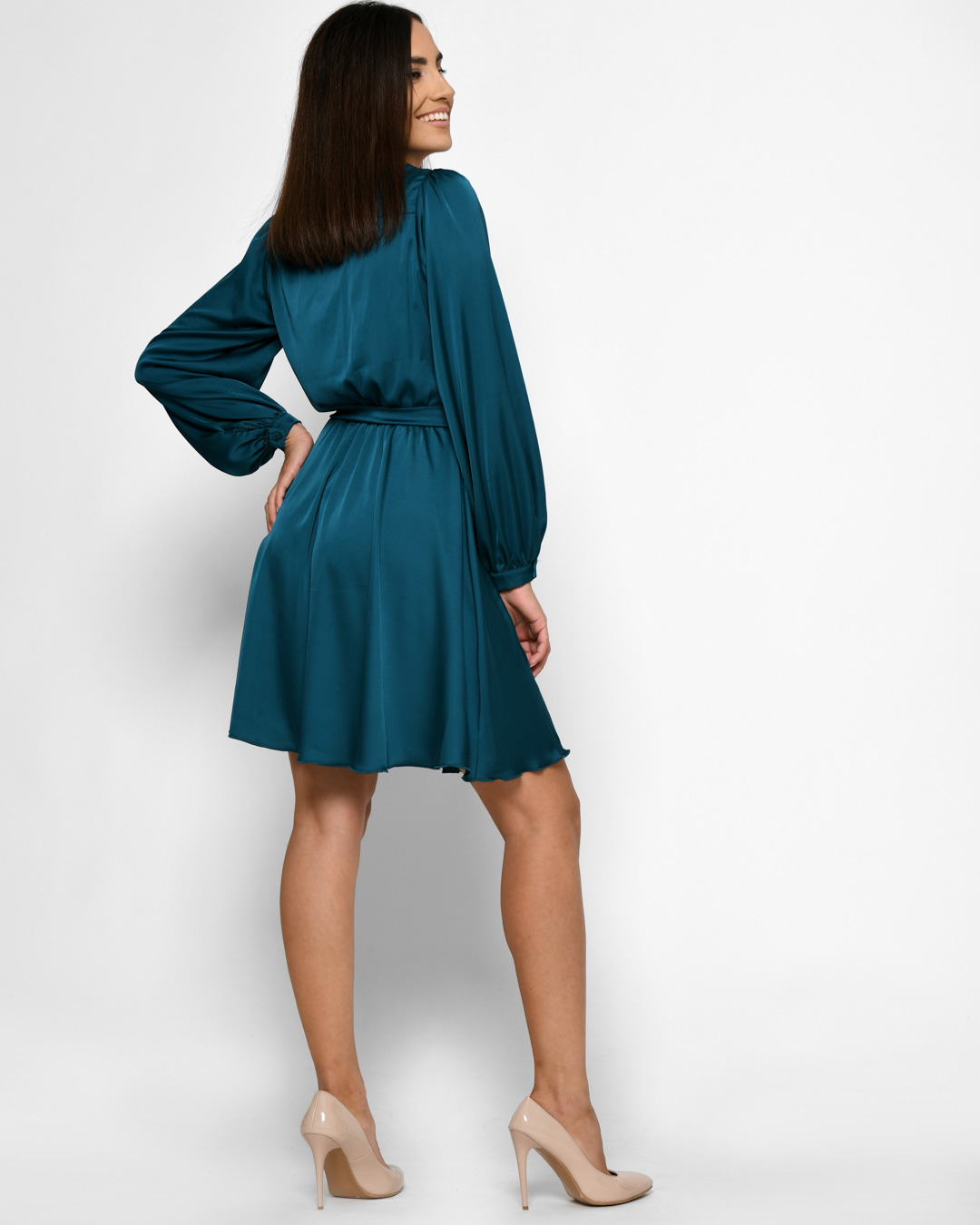 Легкий шелк, длинные рукава на манжетах с пуговицами и расклешенная юбка создают гармоничный образ. Эластичная резинка на талии подчеркивает фигуру. Застежка на скрытые пуговицы. Идеальный выбор для романтических встреч или особых событий.