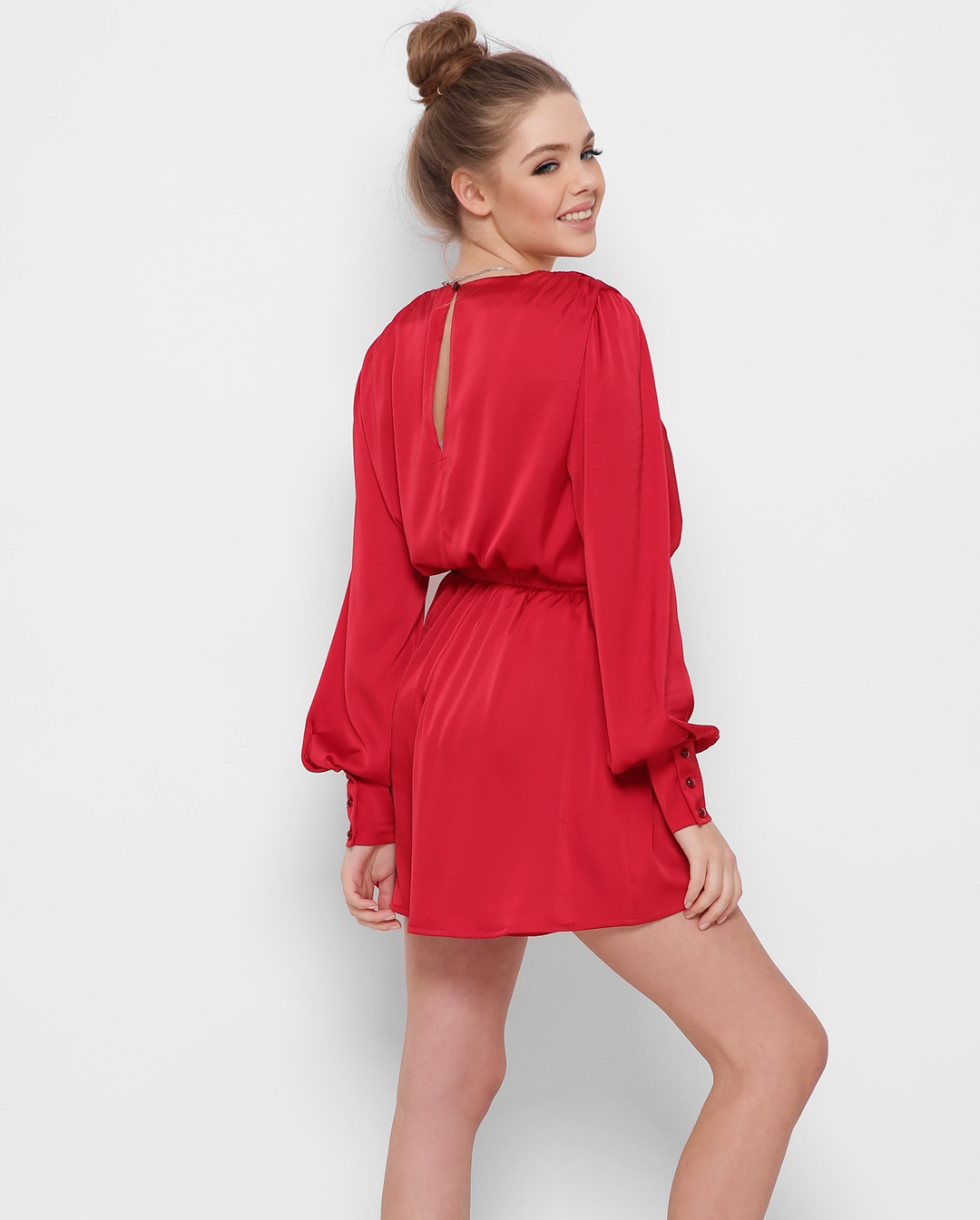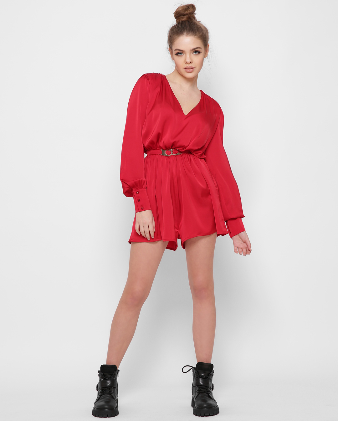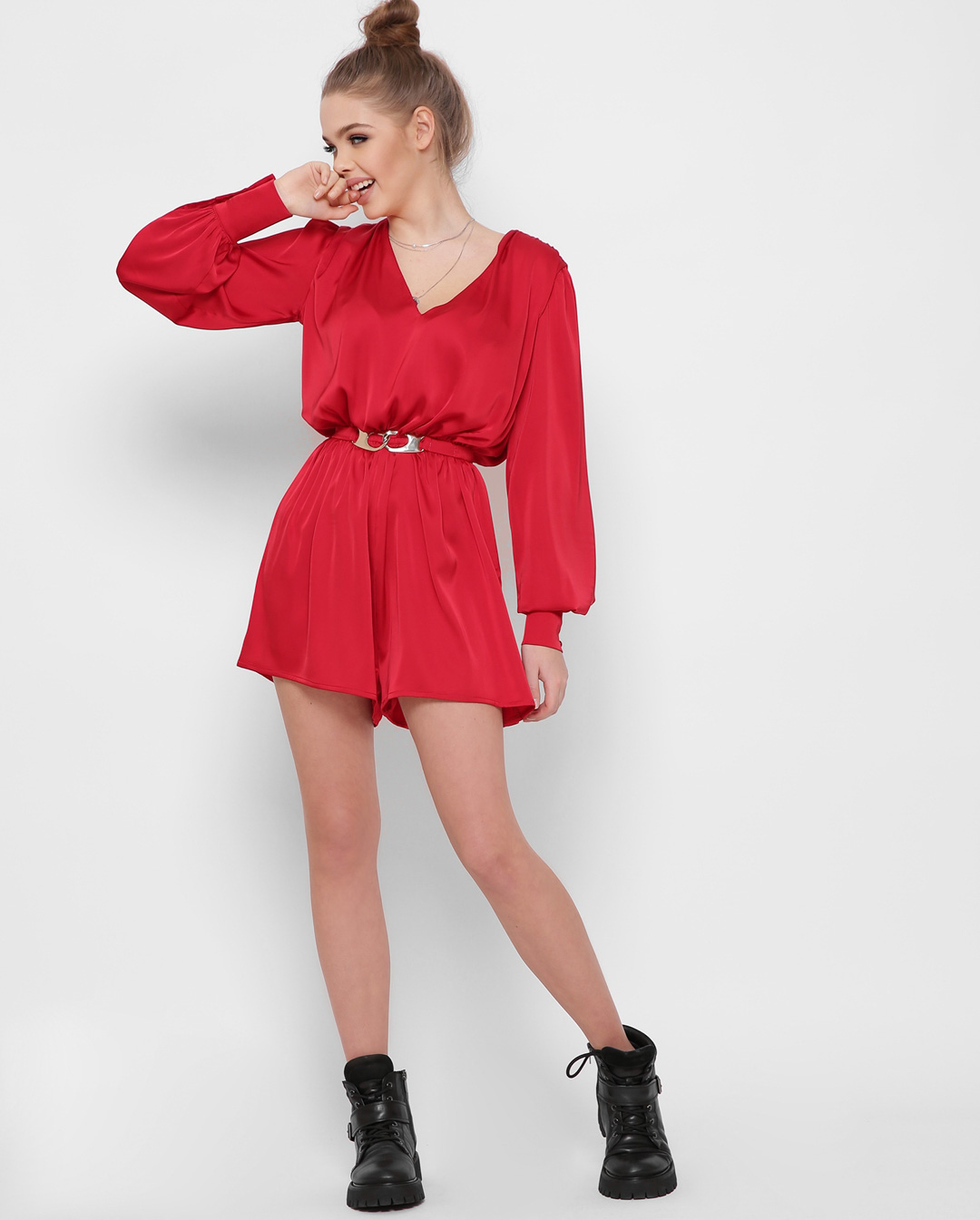 Стильный комбинезон красного цвета. Модель приталенного силуэта с v-образным вырезом, шорты-мини. Широкие и длинные рукава на манжете с пуговицами. В комплекте пояс с пряжкой.