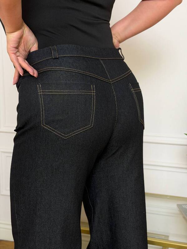 Высокая посадка делает модель особенно удачной для повседневных и более собранных образов. Брюки застегиваются на молнию и пуговицу, благодаря чему посадка выглядит аккуратной и надежной. Широкий крой к низу визуально удлиняет ноги, делает силуэт более гармоничным и добавляет образу легкости. Дополнительным удобством становятся два задних кармана, которые делают модель не только стильной, но и практичной.