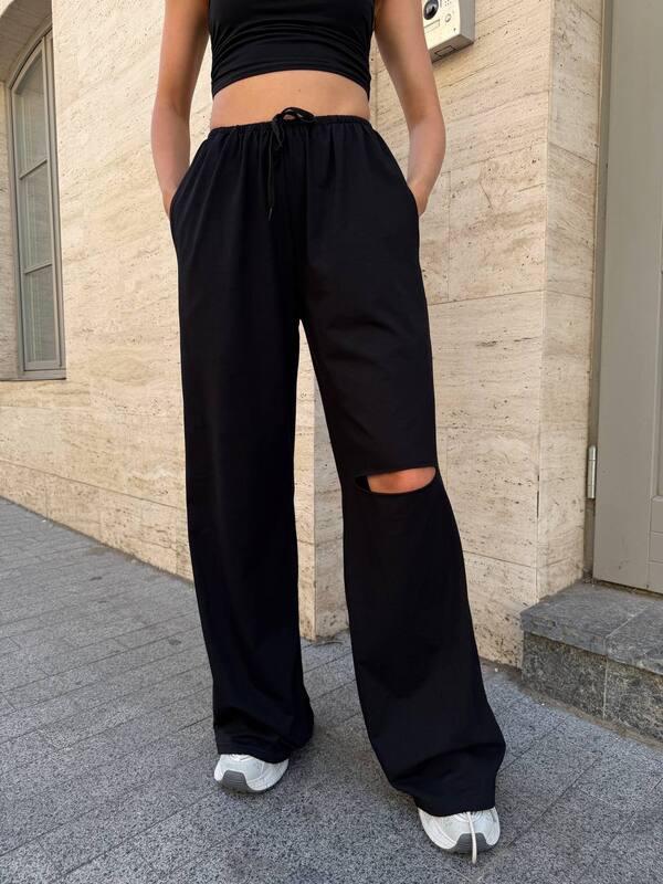 Отдельного внимания заслуживает разрез в области колена. Именно эта деталь делает модель более смелой, трендовой и запоминающейся. Такой акцент добавляет образу характер, помогает выделиться и при этом не перегружает общий вид. Брюки легко сочетаются с короткими топами, майками, футболками, рубашками, оверсайз-жакетами, худи и свитшотами. Их можно носить как с кедами и кроссовками, так и с более акцентной обувью, меняя настроение образа от расслабленного до более дерзкого и эффектного.