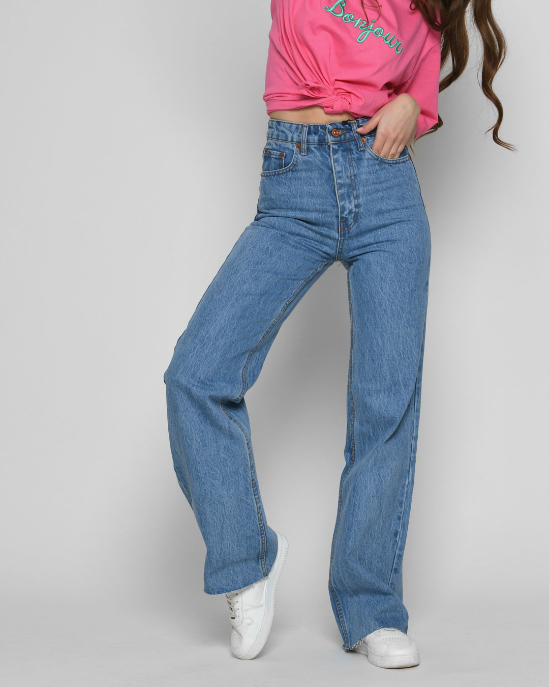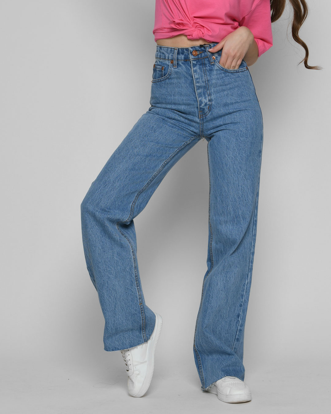 Модные синие джинсы эспаньолы с высокой посадкой и расклешенными штанинами, которые добавляют образу стильности. Пять карманов – три спереди и два сзади – обеспечивают практичность. Застежка на молнии и пуговице делает их удобными в носке. Акцентная деталь – необработанный край, который придает джинсам современный вид.
