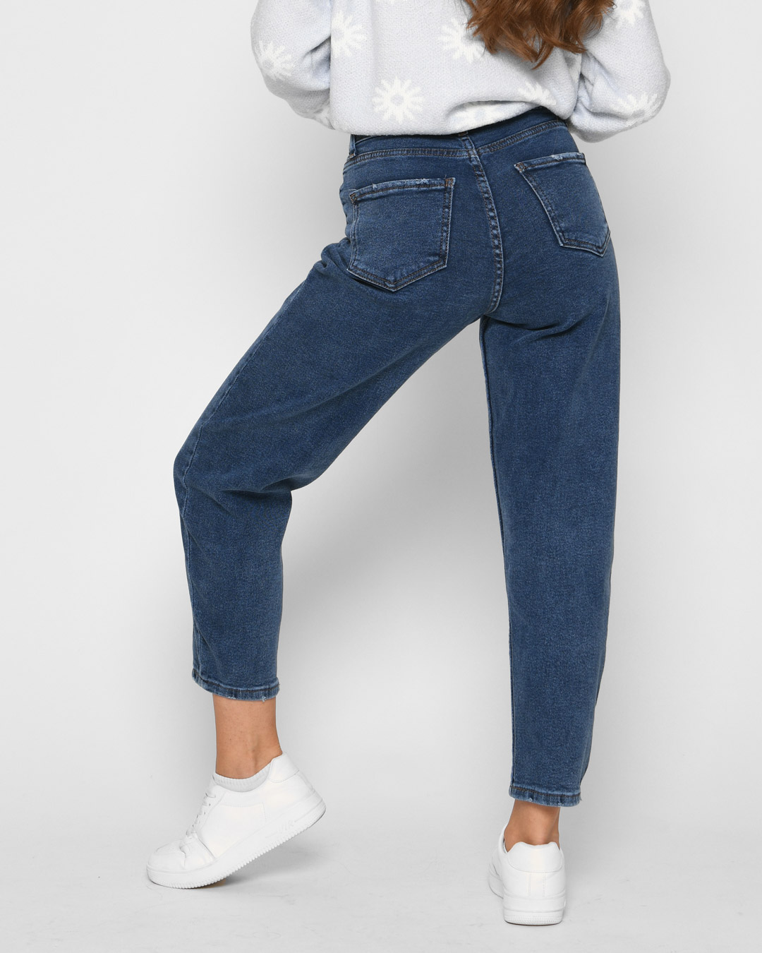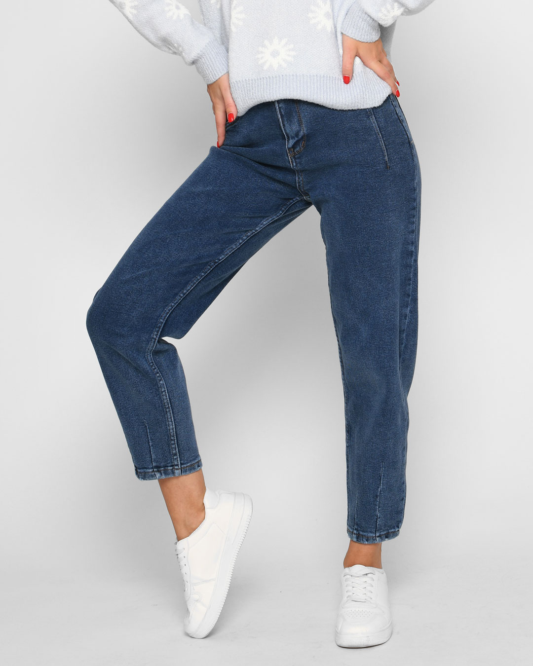 Женские джинсы слоучи синего цвета сочетают стиль и удобство. Модель с высокой посадкой и слегка зауженным силуэтом имеет пять карманов: три спереди и два сзади. Застежка на молнии и пуговице обеспечивает надежность. Акцентной деталью являются потертости на карманах и снизу штанин, что придает образу современный...