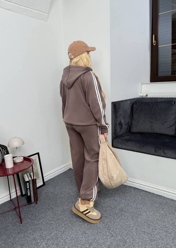 Комплект состоит из оверсайз-толстовки и брюк палаццо. Толстовка имеет свободный крой, капюшон и застёжку на молнии по всей длине, что делает её удобной и практичной. По рукавам расположены лампасные вставки, добавляющие спортивного акцента и визуально вытягивающие силуэт. Внизу толстовки предусмотрены утяжки, позволяющие регулировать посадку и создавать разные варианты ношения — от расслабленного до собранного силуэта. Брюки палаццо с высокой посадкой обеспечивают свободу движений и комфорт, а утяжки по низу позволяют трансформировать их в джоггеры, создавая новый стильный образ.