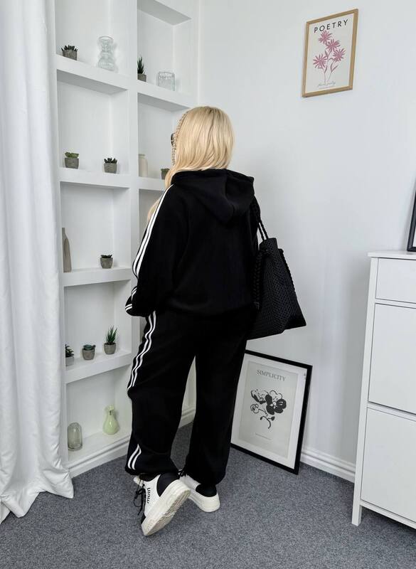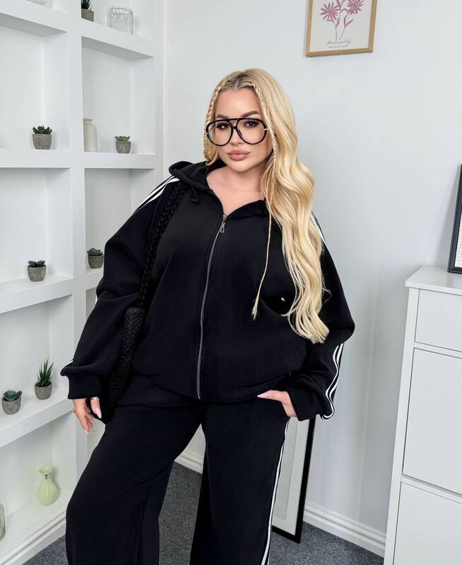 Костюм состоит из двух элементов: свободной толстовки на молнии и брюк палаццо. Толстовка имеет оверсайз-крой, капюшон и лампасные вставки по рукавам, которые придают образу динамичность и спортивный шарм. Внизу толстовки расположены утяжки, позволяющие регулировать посадку и подчеркивать фигуру по желанию. Брюки палаццо с высокой посадкой и свободным кроем обеспечивают комфорт и свободу движений, а утяжки по низу позволяют носить их как классические широкие брюки или трансформировать в джоггеры. Благодаря такому дизайну костюм легко адаптируется под разные образы — от спортивного до уличного casual.